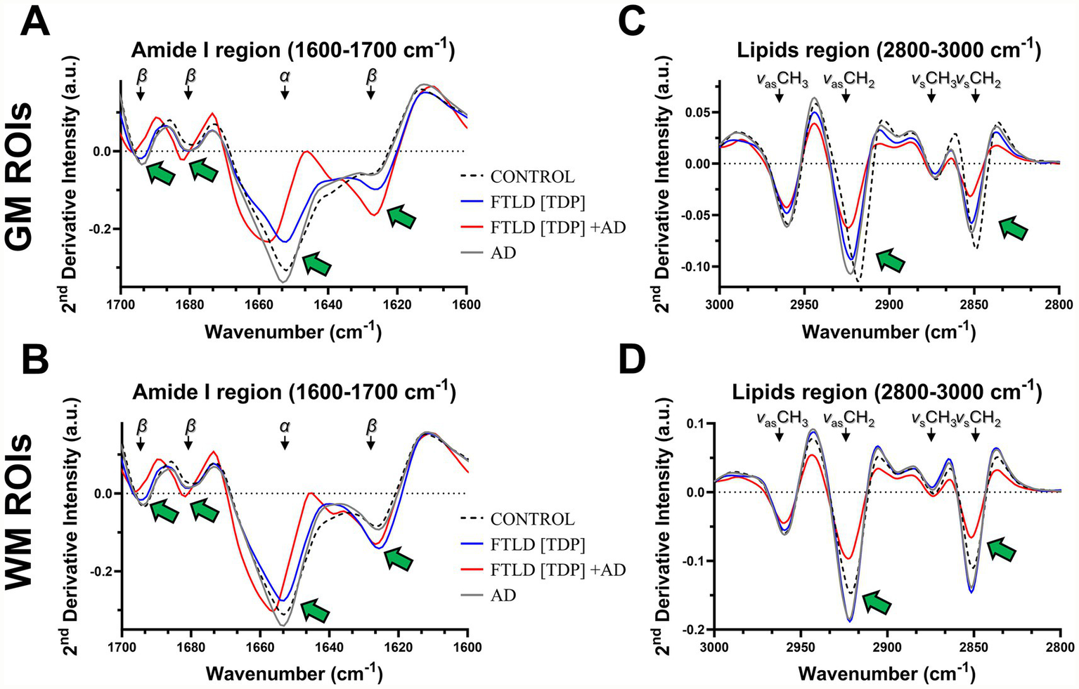 Spectral characterization of neuropathological FTLD samples by FTIR. (A,B) FTIR second derivative spectral analysis of FTLD [TDP] and FTLD [TDP] + AD superior and middle temporal region samples across all GM /WM regions showing characteristic patterns of changes in the amide I region (green arrows indicate peak change). (C,D) Further spectral evaluation across GM/WM ROIs demonstrated the main spectral differences between FTLD cases present in subregions of the lipids window (green arrows).