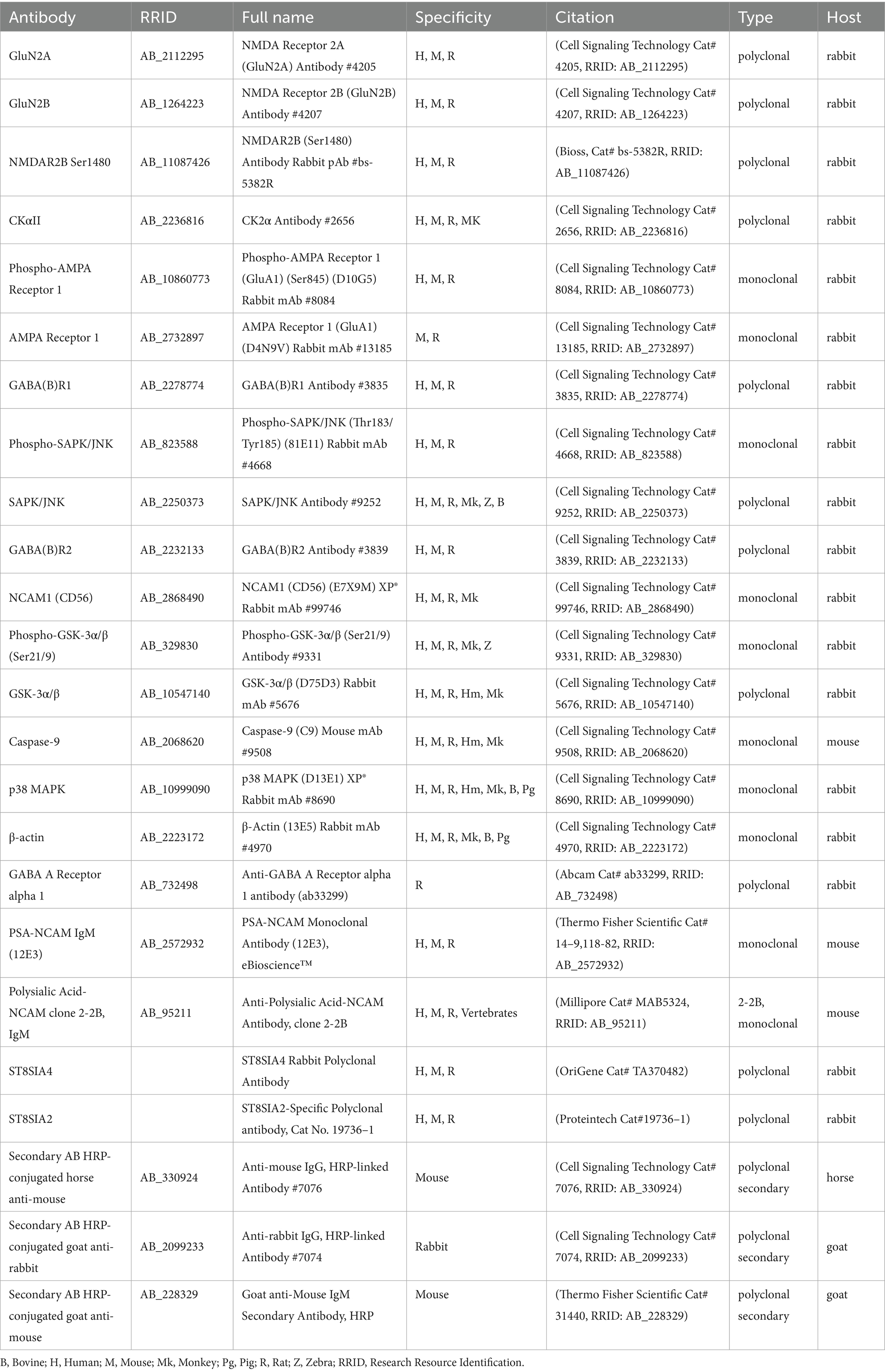 A CRISPR activation (CRISPRa) system was used to upregulate transcription of the ST8Sia4 gene by targeting its promoter with designed guide RNAs. This resulted in elevated expression of ST8Sia4 and, by implication, increased PSA-NCAM levels. To assess the relationship between PSA-NCAM expression and GluN2B phosphorylation, both the engineered ST8Sia4-overexpressing IMR-32 cells and parental IMR-32 cells were co-transfected with GluN1 (SC308819, Origene Technologies Inc., Rockville, MD), GluN2B (SC119642, Origene Technologies Inc., Rockville, MD), and pMaxGFP1 plasmids at a 2:2:1 ratio. After 24 h, cells were harvested, lysed, and subjected to immunoblotting to quantify total GluN2B, pGluN2B (Ser1480), and CKIIα expression, with Actin (Table 1) as a loading control.