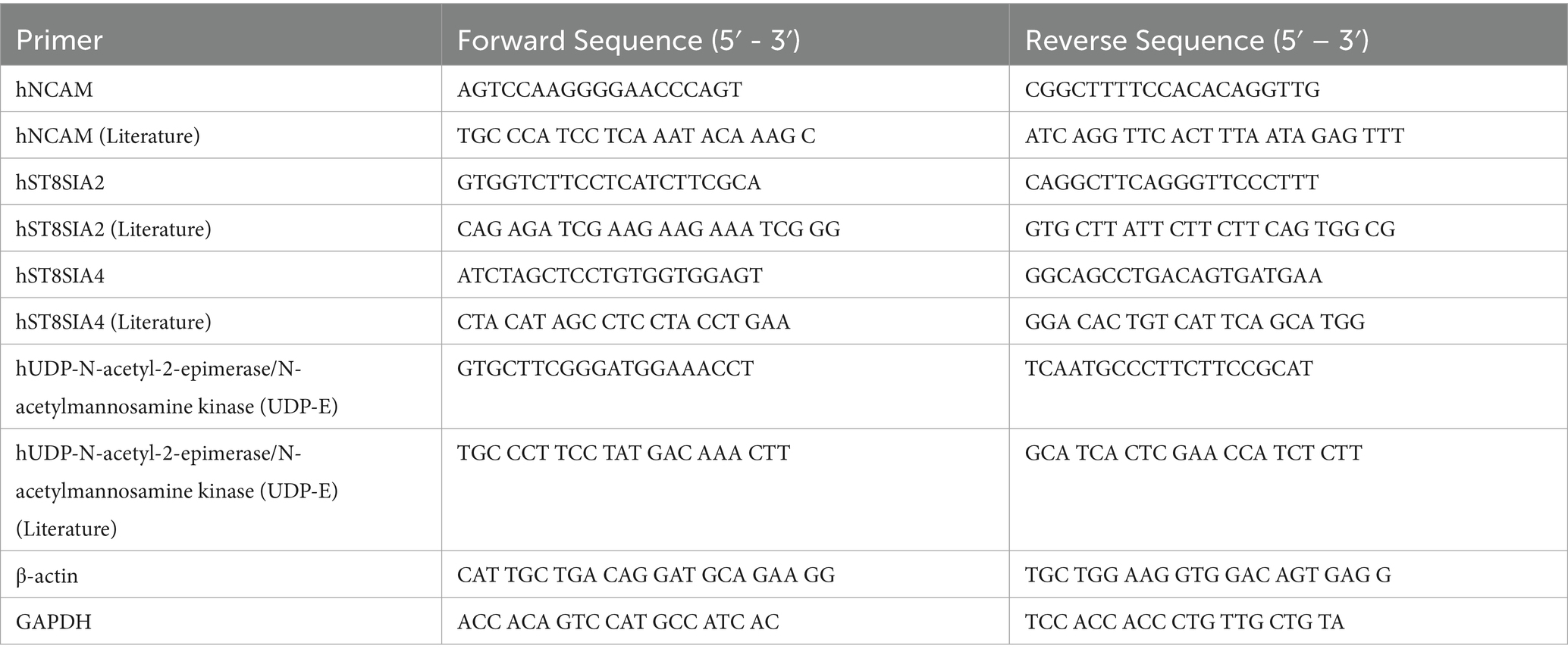 ST8Sia4, h-NCAM, ST8Sia2, UDP-E, GAPDH, and actin mRNA levels were quantified in cell pellets from Aβ treatment groups using RT-qPCR (Table 2). Following cell lysis and homogenization, total RNA was extracted using a column-based isolation method (PureLink RNA Mini Kit, Invitrogen). RNA concentrations were determined with a Tecan NanoQuant Infinite 200 Pro and standardized to 50 ng per sample. Complementary DNA (cDNA) was synthesized from the extracted RNA using the Invitrogen SuperScript III First-Strand Synthesis SuperMix with Oligo (dT) primers in a thermocycler, and subsequently diluted 1:10 with RNase-free water. For RT-qPCR, 2 μL of diluted cDNA was combined with 12.5 μL SYBR Green (Applied Biosystems PowerSYBR Green PCR Master Mix), 9.5 μL RNase-free water, and 1 μL of a forward and reverse primer mix (10 μM; Integrated DNA Technologies, Coralville, Iowa; Zhiyun et al., 2006; Al-Saraireh et al., 2013) to make a 25 μL reaction per well. Non-template controls were included to detect primer contamination and dimerization. Primer efficiency was validated using a standard curve, ensuring values ranged between 90 and 110%. Samples were loaded in triplicate onto a 96-well plate, and RT-qPCR was performed using a Roche Lightcycler 96. The cycling protocol included a 10-min preincubation at 95°C, followed by 40 cycles of amplification (95°C for 15 s, 60°C for 60 s) and a melting curve analysis (95°C for 15 s, 65°C for 15 s, with a 0.2°C/s ramp to 95°C). Cq values were collected using Roche’s Lightcycler 96 SW 1.1 software, averaged, and analyzed via the 2 − ΔΔCT method. To evaluate the effects of Aβ treatment on h-NCAM, ST8Sia4, ST8Sia2, and UDP-E gene expression, RNA from cell pellets was reverse transcribed, and RT-qPCR was conducted on the resulting cDNA, using β-actin as a control for normalization.