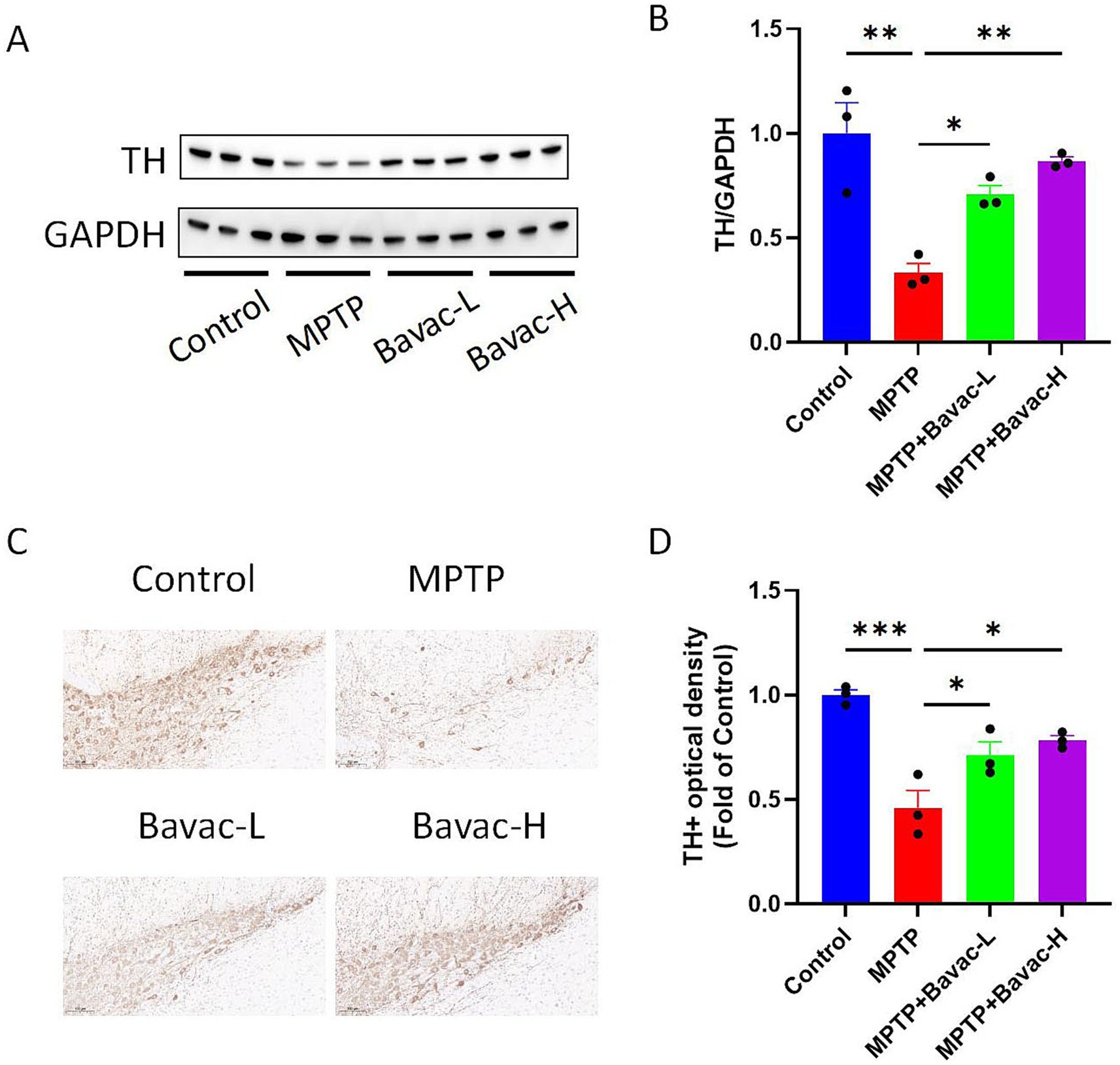 Figure 2. Bavachalcone restores TH expression in the striatum and substantia nigra. (A) Representative western blot of TH in the striatum. (B) Quantification of TH protein expression in the striatum. (C) Representative images of TH immunofluorescence staining in the substantia nigra of mice. (D) Quantification of TH-positive neurons in the substantia nigra. Data are expressed as mean ± SEM (n = 3 per group). *p < 0.05, **p < 0.01, ***p < 0.001. TH, tyrosine hydroxylase.