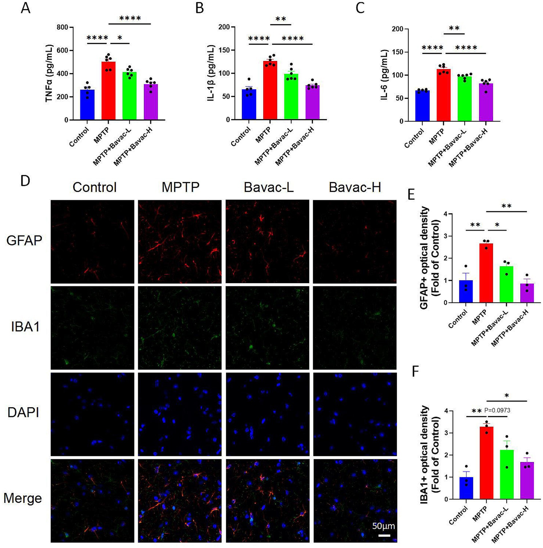 Figure 3. Bavachalcone reduces systemic inflammation and glial activation in MPTP-induced PD mice. (A–C) ELISA analysis of serum levels of proinflammatory cytokines TNF-α, IL-1β, and IL-6. MPTP administration significantly increased cytokine levels, which were attenuated by bavachalcone treatment in both low and high doses. n = 5–6 per group. (D) Representative immunofluorescence images of GFAP (astrocyte marker, red), IBA1 (microglial marker, green), and DAPI (nuclear stain, blue) in the substantia nigra. MPTP induced pronounced glial activation, whereas bavachalcone treatment mitigated astrocytic and microglial reactivity. Scale bar = 50 μm. (E–F) Quantification of GFAP and IBA1 immunofluorescence intensity in the substantia nigra (SN) of mice. n = 3 per group. Data are expressed as mean ± SEM. *p < 0.05, **p < 0.01, ***p < 0.001, ****p < 0.0001. PD, Parkinson’s disease; ELISA, enzyme-linked immunosorbent assay; SEM, standard error of the mean.