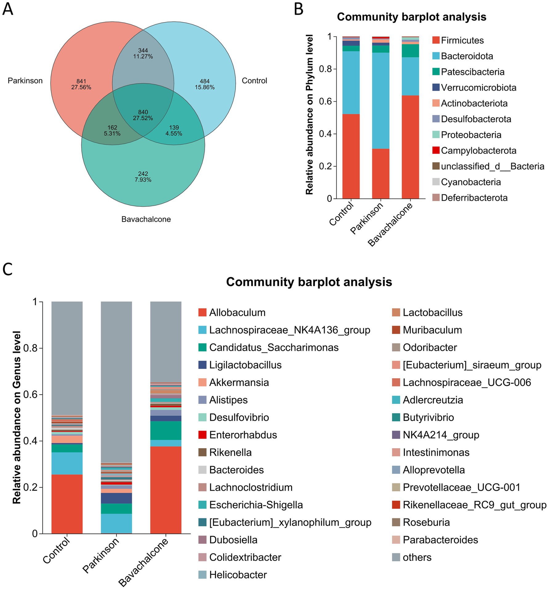 Figure 5. Bavachalcone reshapes gut microbiota composition at different taxonomic levels in PD mice. (A) Venn diagram showing shared and unique OTUs among treatment groups. (B) Community bar plot analysis at the phylum level. (C) Community bar plot analysis at the genus level. PD, Parkinson’s disease; OTU, operational taxonomic unit.