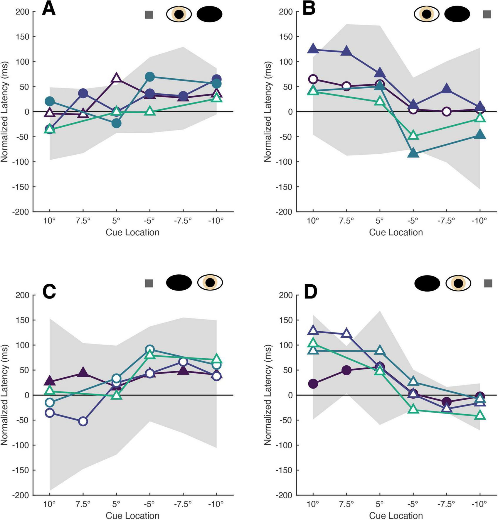 The latencies of patients’ target-directed saccades are modulated by cue position. Each panel shows the mean normalized latencies of all patients (Patient A: purple, Patient B: dark blue, Patient C: blue, Patient D: green) for each viewing eye [right eye in panel (A,B), left eye in panel (C,D)] and target location [rightward targets in panel (A,C), leftward targets in panel (B,D)] condition. Panels are oriented such that one is viewing the patient: rightward target locations are shown to the left, and indicated with positive numbers on the abscissa, and vice versa. The shading and shape of datapoints differentiate the sound vs. affected eyes (filled vs. unfilled) and sound vs. affected hemi-fields (circles vs. triangles). The gray shaded region represents the 95% confidence interval obtained from sampling the mean latencies of the non-strabismic participants.