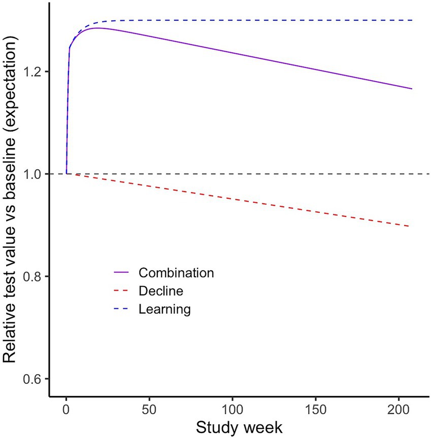 The learning function had maximum = 1.3 and rate = 0.2 as parameters, corresponding to an improvement from baseline approaching 30% with 80% of the effect reached after 14 runs (simulating a run-in baselining phase of 2 weeks of daily runs). These may be conservative estimates compared to data from the literature, considering the dense initial testing schedule in a population of elderly subjects with modest cognitive impairment (Bartels et al., 2010; Zheng et al., 2022). Cognitive decline was modeled for all tests as the constant 1 (no decline) until the 14th run and a linear function of the run thereafter, with rates that were varied in different simulations.
