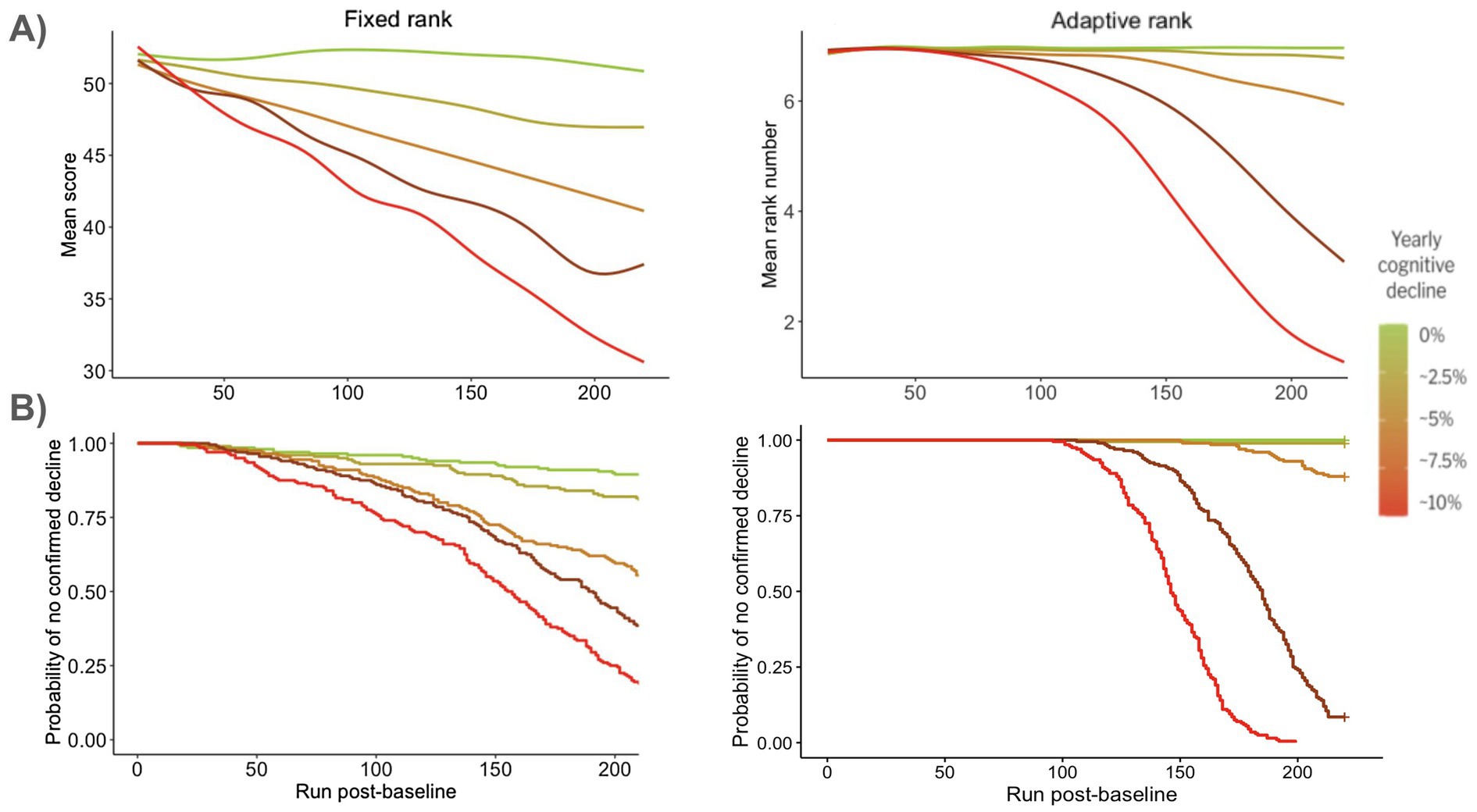 Sensitivity to change and between-groups discriminative ability (reflecting pharmacodynamic responsiveness of candidate biomarkers of disease modification) of the Fixed vs. Adaptive rank testing paradigms differed according to parameters of the cohorts/studies. Figure 2 depicts the trajectory of the mean score/rank values over time (Figure 2A) and the analysis of the time to confirmed decline (Figure 2B) for five discrete rates of cognitive decline between 0 and 10%/year. In the fixed-rank paradigm, for both types of analysis, the separation of the curves is rather gradual both as a function of time (i.e., run number) and of the decline rate. In contrast, for the adaptive-rank paradigm, the separation appears non-linear both as a function of time and decline rate: i.e., for the first 1–2 years there is no or minimal separation, but then trajectories separate quickly in particular for the intermediate range of the evaluated rates of decline, corresponding to 2.5–7.5% per year.