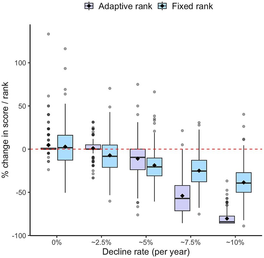 The adaptive rank paradigm outperformed the fixed rank paradigm also in terms of ability to discriminate, e.g., between decline rates of 5 and 7.5%, as measured by Cohen’s d calculated for different types of endpoints (Table 1).