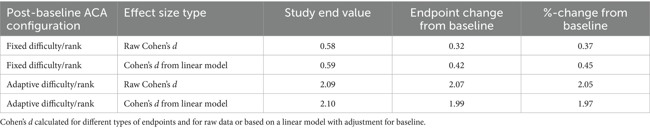 Methods: In simulations of cohorts of patients with cognitive impairment, we compared two ACAs paradigms: after 14 daily tests allowing performance-based difficulty adaptation, the difficulty level was either (1) fixed or (2) kept adaptive for a period of 4 years with weekly testing. Sensitivity to between-group effects was assessed in cohorts characterized by cognitive decline observed in neurodegenerative diseases.