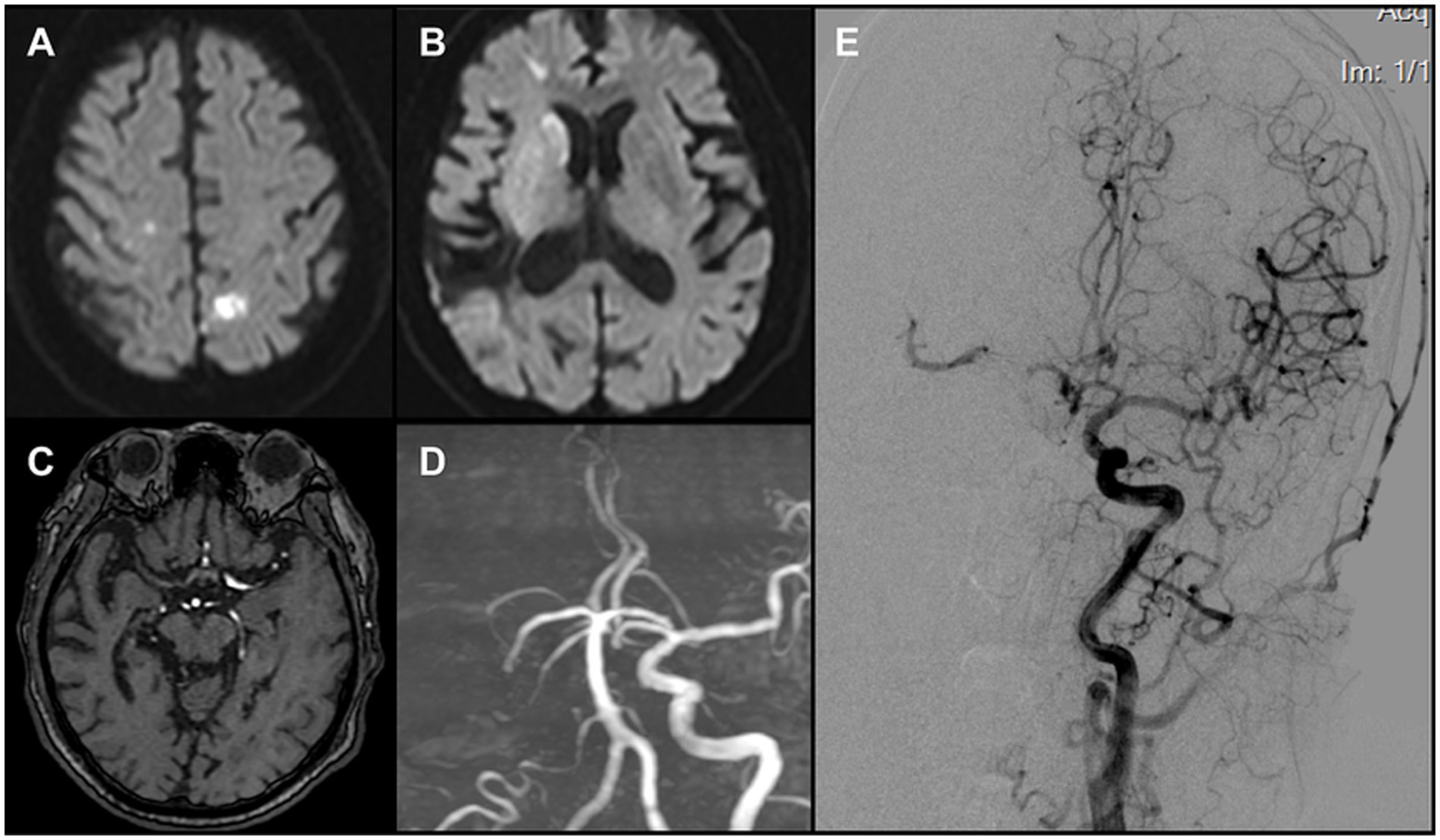 Figure 1. (A,B) DWI revealed multiple acute infarcts involving the right caudate head and the bilateral frontal and parietal cortices. (C) Original MRA images demonstrated non-visualization of the right middle cerebral artery (MCA). (D) TOF 3D reconstruction demonstrated non-visualization of the right internal carotid artery (ICA) and the right MCA (E) Left carotid angiography indicated a patent anterior communicating artery. A thrombus was identified in the proximal right MCA, causing subtotal occlusion, while compensatory flow to the MCA territory was provided by the collateral circulation.