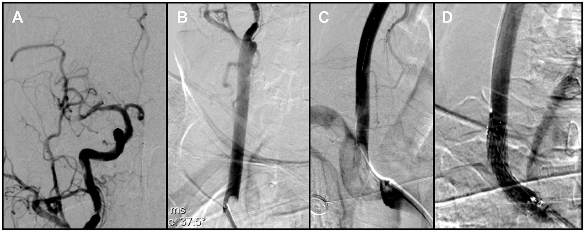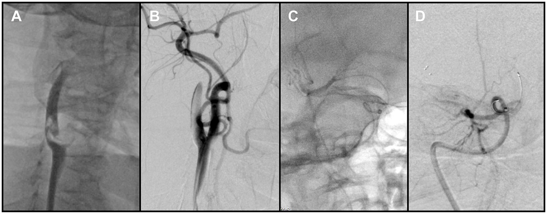 Figure 2. (A) Right carotid angiography revealed a free-floating thrombus at the carotid bifurcation. (B) Following removal of the proximal thrombus, angiography showed persistent non-opacification of the distal right internal carotid artery (ICA). (C) Contrast injection after crossing of the occluded segment by the microcatheter delineated the distal vessel. (D) Post-stent deployment angiography demonstrated absence of antegrade flow across the occluded segment.