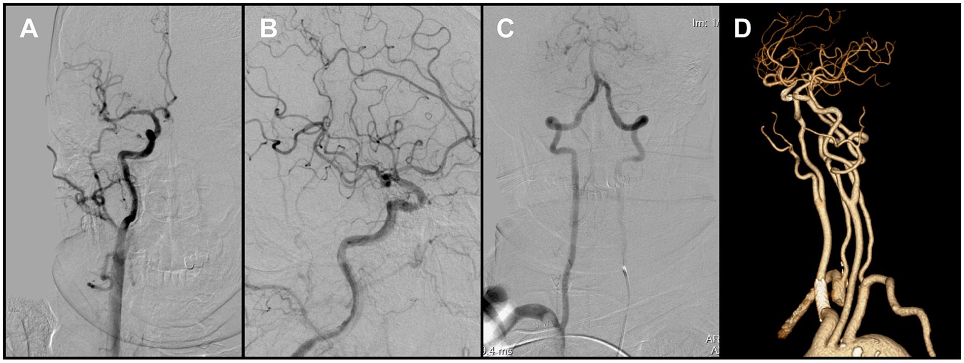 Figure 4. (A,B) Final angiography prior to procedural completion demonstrated reperfusion of the right carotid system (mTICI grade 2C). (C) Left vertebral angiography showed retrograde flow in the right vertebral artery. (D) Follow-up CTA at 1 month demonstrated persistent occlusion of the right subclavian artery.