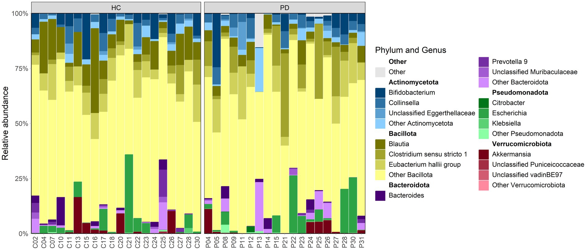 Figure 1. Comparative overview of dominant phylum and genus-level microbial composition in PD and HC individuals; corresponding phyla highlighted in bold above each genus group.