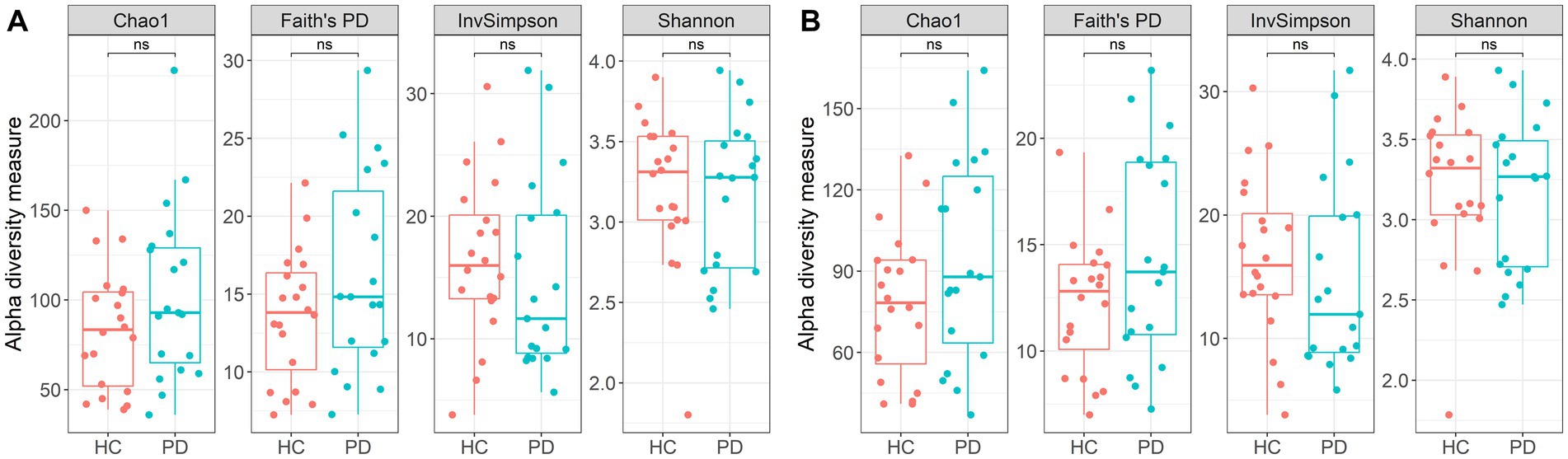 Figure 2. Alpha diversity metrics: Faith’s phylogenetic diversity, inverse Simpson index, observed number of unique sequences and Shannon index on (A) all sequences; (B) after rarefaction; ns – not significant (FDR-adjusted p, Wilcoxon rank-sum test).