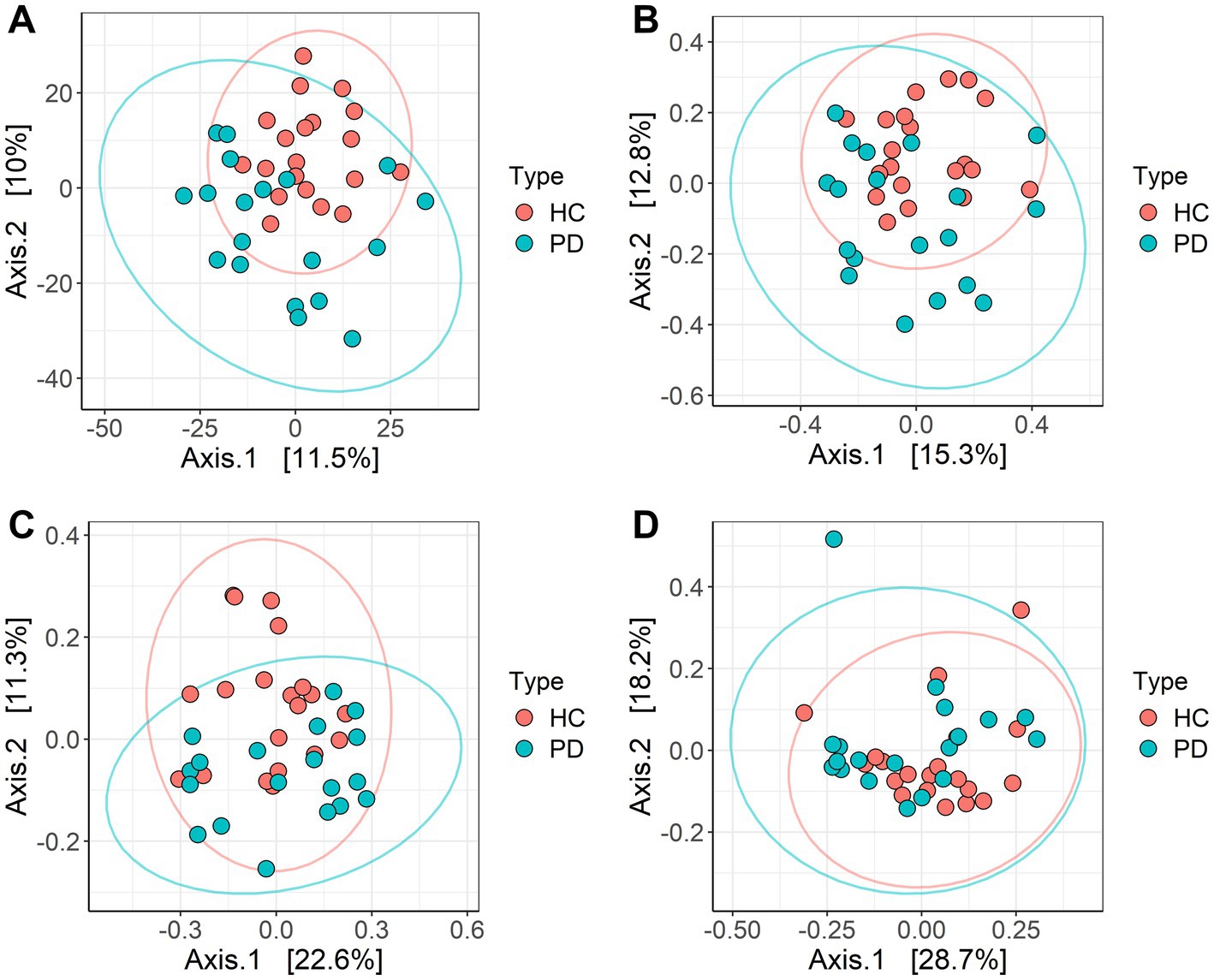 Figure 3. PCoA analysis based on (A) Aitchinson distance, (B) Bray-Curtis distance, (C) unweighted Unifrac distances, and (D) weighted Unifrac distances. Colors represent sample types: red – HC; blue – PD; ellipses are drawn at 95% confidence level. The percentage of variation explained by the first two dimensions is indicated on respective axes.