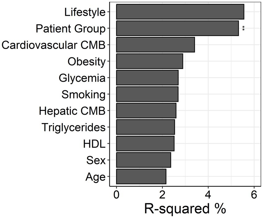 Figure 4. Adonis PERMANOVA comparison with metadata for entire study population; R-squared refers to amount of Aitchinson variation associated with each category; **p < 0.01.