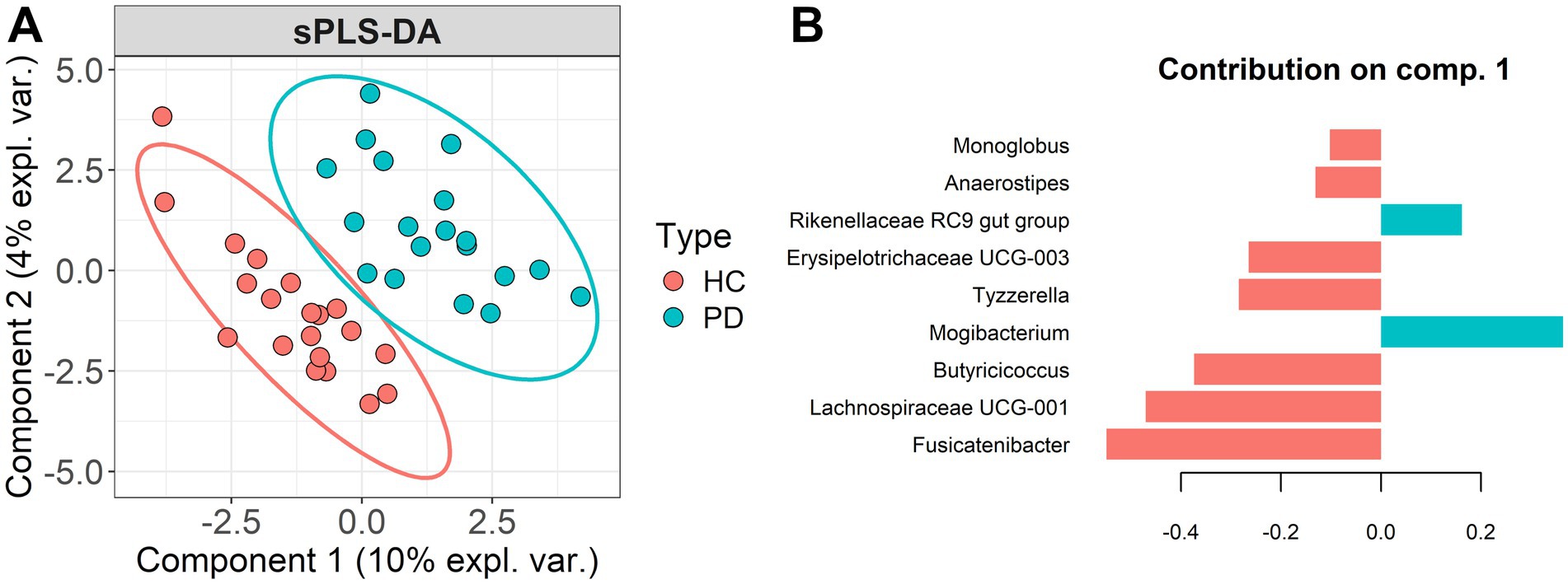 Finally, it is important to note that while traditional diversity metrics failed to reveal statistically significant differences between PD and HC groups, sPLS-DA and LEfSE successfully identified distinct microbial signatures that differentiate the two cohorts. Neither α-diversity (including phylogenetic diversity, richness, or evenness indices) nor global β-diversity metrics such as Bray–Curtis or UniFrac distances demonstrated consistent or robust group separation. This suggests that overall community diversity and phylogenetic structure may not differ markedly between groups at the global level. In contrast, sPLS-DA, which emphasizes feature selection and supervised discrimination, was able to uncover subtle but biologically meaningful compositional shifts by identifying specific genera that contribute to between-group variance. These findings illustrate a key advantage of supervised, log-ratio-aware multivariate methods in detecting targeted changes that are not captured by unsupervised diversity metrics. The results support the notion that PD-associated dysbiosis may not manifest through gross alterations in diversity but rather through nuanced shifts in the relative abundance of key microbial taxa, particularly those involved in SCFA production and mucosal health.