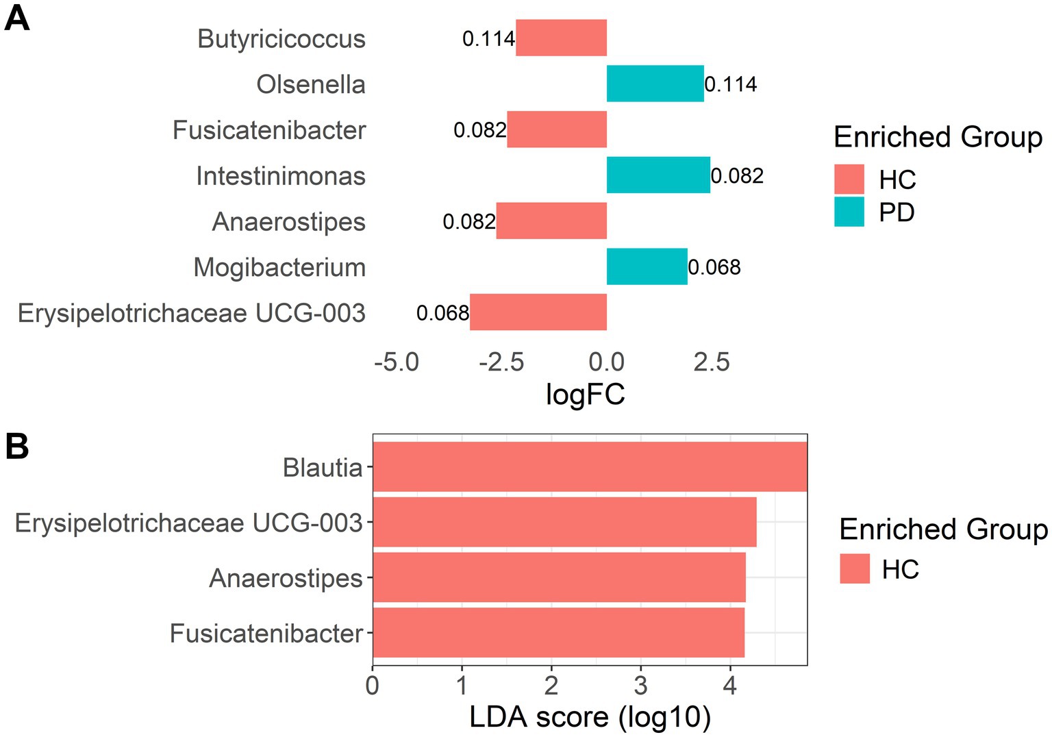 LEfSe analysis confirmed the enrichment of several HC-associated taxa, identifying four genera with significantly higher abundance in the HC group (LDA score > 4.1, adjusted p < 0.01) (Figure 6B). No genera were found to be significantly more abundant in the PD group, again emphasizing group heterogeneity. Importantly, the LEfSe-identified taxa overlapped with those found via sPLS-DA and linear models, and additionally Blautia, another known SCFA-producing genus.