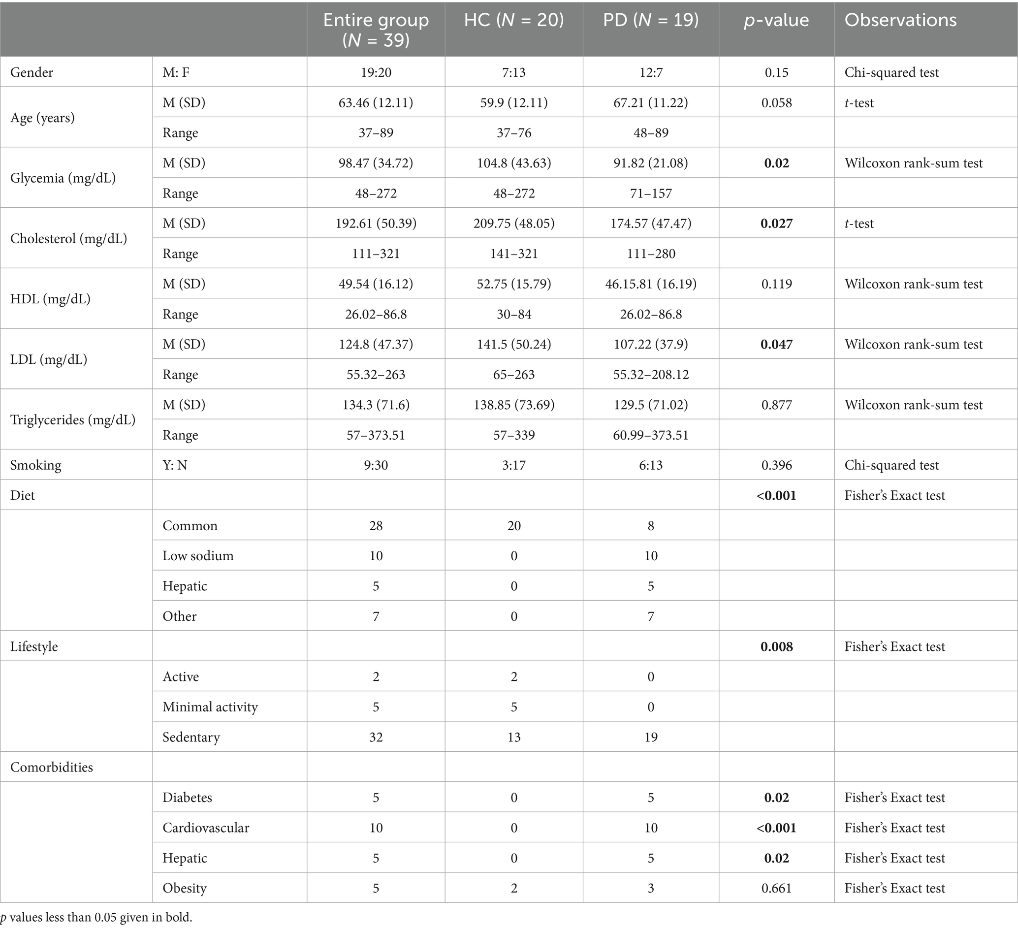 Smoking prevalence did not differ significantly between groups (χ2 = 0.72, p = 0.396), although PD participants tended to report higher smoking rates (31.6%) than controls (15%). In terms of dietary habits, a significant divergence was noted (Fisher’s exact test, p < 0.001): all HCs followed a common (unrestricted) diet, whereas PD patients adhered to a variety of restrictive regimens including low sodium, hepatic, and hypoglycemic plans. These diets were largely prescribed in response to comorbid conditions and may contribute to differences in microbiota profiles. Lifestyle data further highlighted disparities between groups (Fisher’s exact test, p = 0.008). While all HCs reported either sedentary or minimally active routines, all PD participants reported a sedentary lifestyle, consistent with the mobility limitations often associated with the disease. Finally, comorbidity prevalence differed substantially across groups: cardiovascular disease (p < 0.001), hepatic disorders (p = 0.02), and diabetes mellitus (p = 0.02) were significantly more common in PD patients. Obesity, by contrast, was equally distributed between groups (p = 0.661).