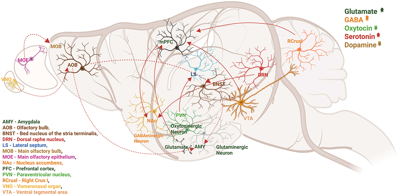 Figure 1. Local and distal circuits involved in social behaviors are depicted in a sagittal image of the rodent brain. Numerous neurotransmitters and neuromodulators collaborate to coordinate the activity of brain regions and neural circuits. Studies indicate that autism is linked to disruptions in neurotransmitter systems, including glutamate, GABA, serotonin (5-hydroxytryptamine, 5-HT), melatonin, dopamine (DA), OT, and arginine vasopressin (AVP). Therefore, dynamic variations in neurotransmitter concentration, release, and receptor density may directly impact behavioral performance and neuronal circuit function.
