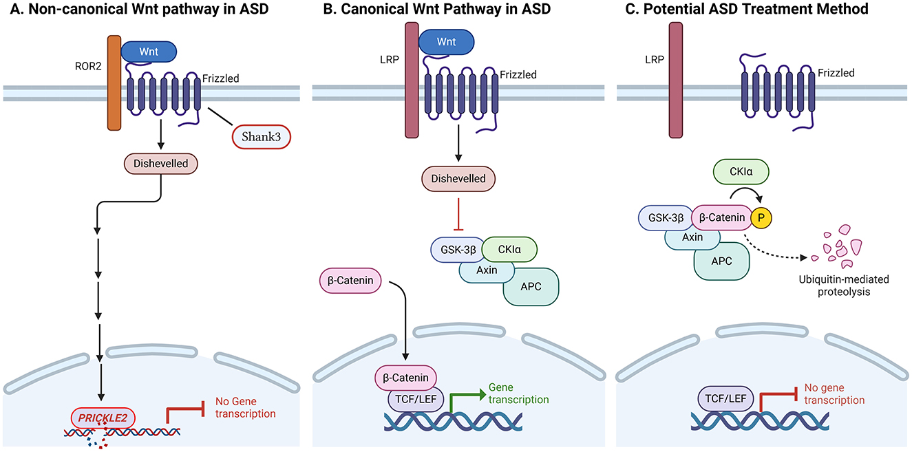 Figure 2. Anomalies in the canonical and non-canonical Wnt signaling pathways are the cause of autism spectrum disorders (ASDs). (A) Disruptions in non-canonical Wnt genes, such as PRICKLE2, may exacerbate the synaptic defects that underlie ASDs. Mice with PRICKLE2 disruption exhibit atypical behavior, such as impaired social interaction, improper learning, and rigid conduct. In mouse hippocampal neurons, PRICKLE2 disruption resulted in decreases in post-synaptic density size, synapse number, and dendritic branching. (B) The canonical Wnt pathway is β-catenin-mediated. Wnt target genes associated with ASD can be activated by stabilized β-catenin entering the nucleus and dislodging Goucho/transducin-like enhancer of split (TLE) repressors from T-cell factor/lymphoid enhancer factor (TCF/LEF) transcription factors. (C) The destruction complex, which includes Axin, adenomatous polyposis coli (APC), casein kinase 1 alpha (CK1α), and glycogen synthase kinase 3 beta (GSK3β), constitutively breaks down β-catenin in the absence of Wnt activation or due to the presence of an inhibitor. The breakdown of β-catenin through the ubiquitin-mediated proteasome pathway is facilitated by phosphorylation by GSK3β and CK1α. Deactivation of Wnt could be used as a potential ASD treatment method.