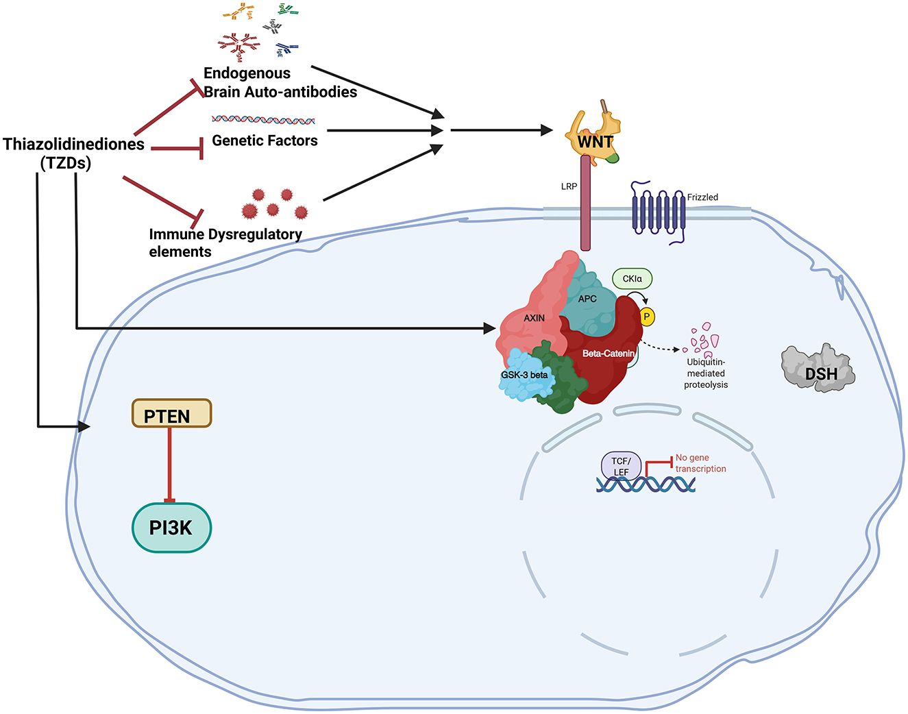 Figure 4. The canonical WNT/β-catenin pathway and PPARγ have an antagonistic relationship in ASD. By preventing the release of inflammatory factors and cytokines. Thiazolidinediones act as PPARγ agonists which can directly prevent neuroinflammation. PPARγ agonists directly activate DKK1 to block the WNT pathway. When PPARγ agonists are administered, the WNT pathway is downregulated due to the antagonistic relationship between PPARγ and the canonical WNT/β-catenin pathway.