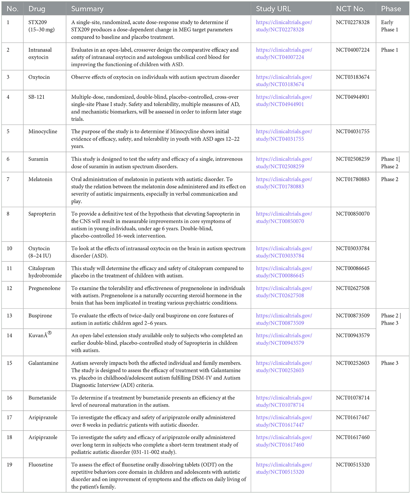 Integrating clinical and translational treatment studies, the United States has invested more than USD 110 million in ASD research networks and institutes over the past 20 years (excluding individual initiatives). Risperidone (McCracken et al., 2002), Methylphenidate (Kim S. J. et al., 2017; Joshi et al., 2020), Guanfacine (Politte et al., 2018; Scahill et al., 2015), Secretin (Levy et al., 2003; Williams et al., 2012), Aripiprazole (Hirsch and Pringsheim, 2016), plus language intervention (Williams et al., 2024), Citalopram (Wichers et al., 2019), Fluoxetine, Intranasal Oxytocin (Sikich et al., 2021), Escitalopram (Owley et al., 2010), Buspirone (Chugani et al., 2016; Ghanizadeh and Ayoobzadehshirazi, 2015), are some of the molecules which were investigated. Integrating clinical and translational treatment studies, the United States has invested more than USD 110 million in ASD research networks and institutes over the past 20 years (excluding individual initiatives). There are still more clinical trials going on. The Autism Centers of Excellence (ACE) Centers and Networks programs continue these extensive programmatic NIH ASD research activities. The Innovative Medicines Initiative 2 (IMI2)-funded Multicenter Study for Developing New Medications (EU-AIMS; http://www.eu-aims.eu) is well underway, focusing on biomarker identification and individualized treatment regimens. Coupled with initiatives from privately financed organizations and industry, other cross-collaborative options, including Canada's POND network, have complemented and greatly aided the endeavor to collect complementary data. At the same time, smaller controlled studies of Oxytocin (Lemprière, 2022), Vasopressin (Parker et al., 2019; Bolognani et al., 2019), D-Cycloserine (Urbano et al., 2014; Minshawi et al., 2016; Wink et al., 2017), N-Acetylcysteine (Wink et al., 2016; Ghanizadeh and Moghimi-Sarani, 2013), CX516 (Berry-Kravis et al., 2006), Donepezil (Gabis et al., 2019; Handen et al., 2011; Buckley et al., 2011), and Fluoxetine (Lucchelli and Bertschy, 2018) have been completed, along with pharma-supported Phase II and III ASD. An increasing number of randomized controlled trials (RCTs) have focused on fundamental impairments, such as social withdrawal, in individuals with Arbaclofen treated for autism spectrum disorder (ASD) and fragile X syndrome (FXS). Additionally, many of these trials have targeted related symptoms, including irritability, hyperactivity, and anxiety, as their primary objectives. Although some businesses have deemed drug development for neurodevelopmental disorders (NDDs) to be too risky, a growing understanding of the neurobiology and genetics of ASD is causing this perspective to shift, thereby paving the way for the discovery of medicines for various behavioral endpoints in people with ASD (Ameis et al., 2018). Only three EMA and two US FDA indications have been approved thus far, and they are all for “irritability” or sleeplessness related to ASD.
