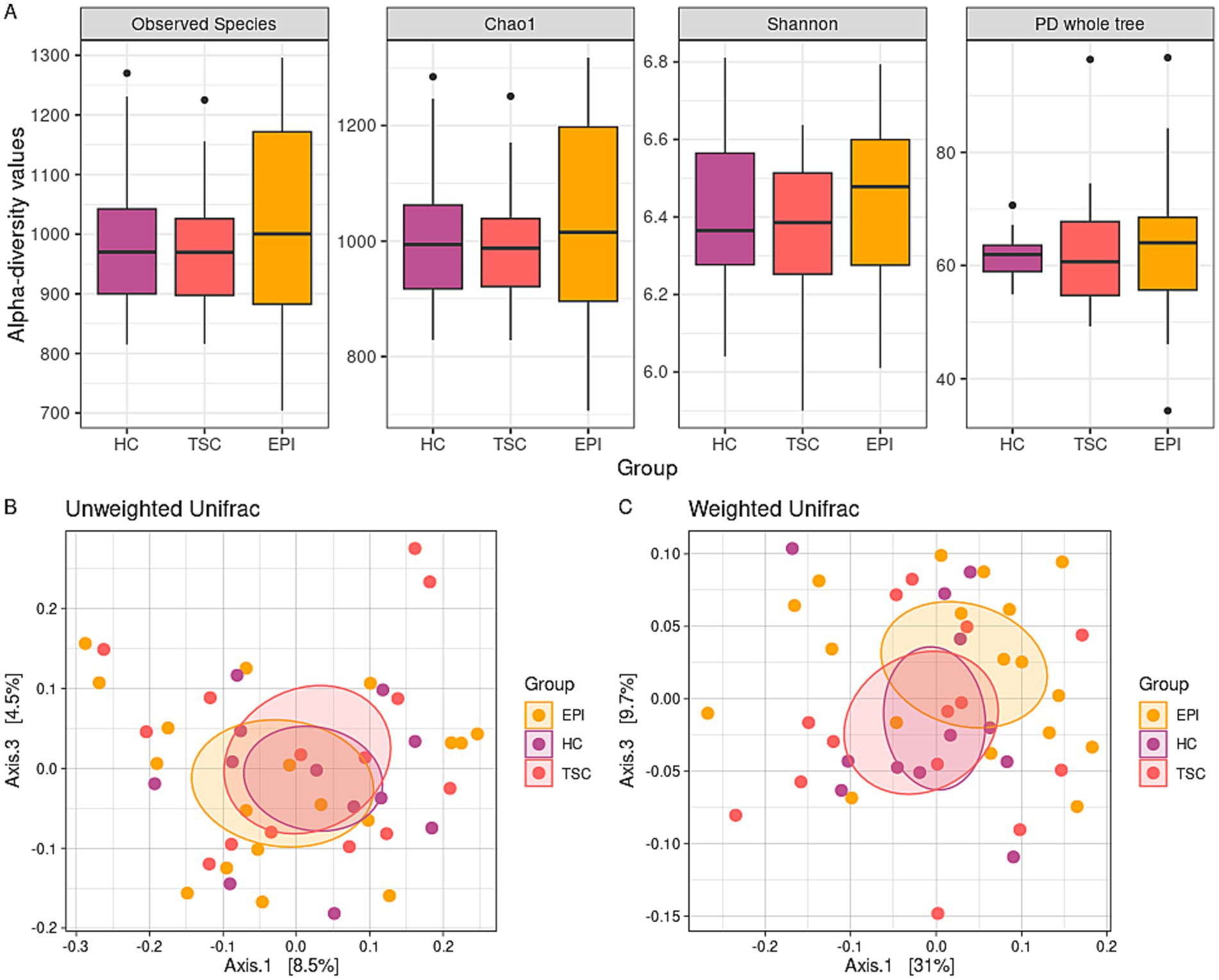 Alpha-diversity analyses (Figure 1A) did not indicate significant differences between the HC, TSC, and EPI groups for both species richness and biodiversity.