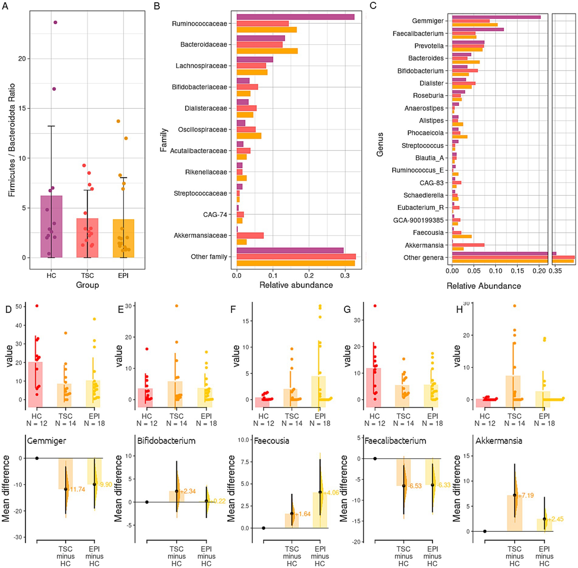 Figure 2. Taxonomy analysis. Panel A: boxplot of the ratio between the abundance of Bacteroidota and Firmicutes phyla in the three groups. Mean ratios (SD) are HC 6.23 (6.98), TSC 3.93 (2.84), EPI 3.85 (4.18). Panel B: Taxonomy analysis at family level of the gut microbiota in HC, TSC, and EPI groups. Panel C: relative abundance of bacteria genera. Only taxa with a mean relative abundance > 0.01 in at least one of the two experimental groups have been reported. See Supplementary Table S2 for the full list and statistics. Panel D–H: Gardner-Altman estimation plots for, respectively, the genera Gemmiger (D), Bifidobacterium (E), Faecousia (F), Faecalibacterium (G), Akkermansia (H). The upper parts of the plots depict the groups’ abundances and distribution among the single samples; the lower parts report TSC and EPI average differences and effect sizes with respect to the HC group (set as 0).