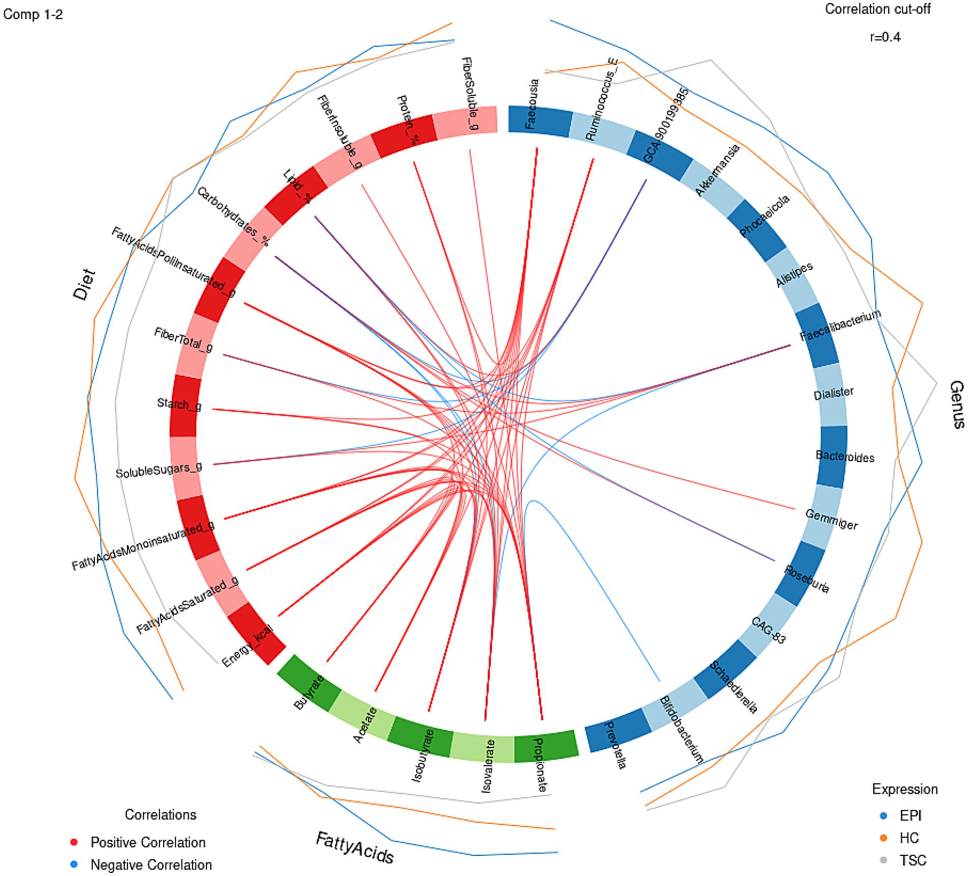 Figure 4. Circular plot for dietary macronutrient (red block), key metabolites (green block), microbial genera (blue block) data integration, with a |r| = 0.4 correlation cutoff. Positive associations are depicted with red lines, negative ones in light blue. External blue, gray, and orange lines represent the features’ expression in EPI, TSC, and HC, respectively.