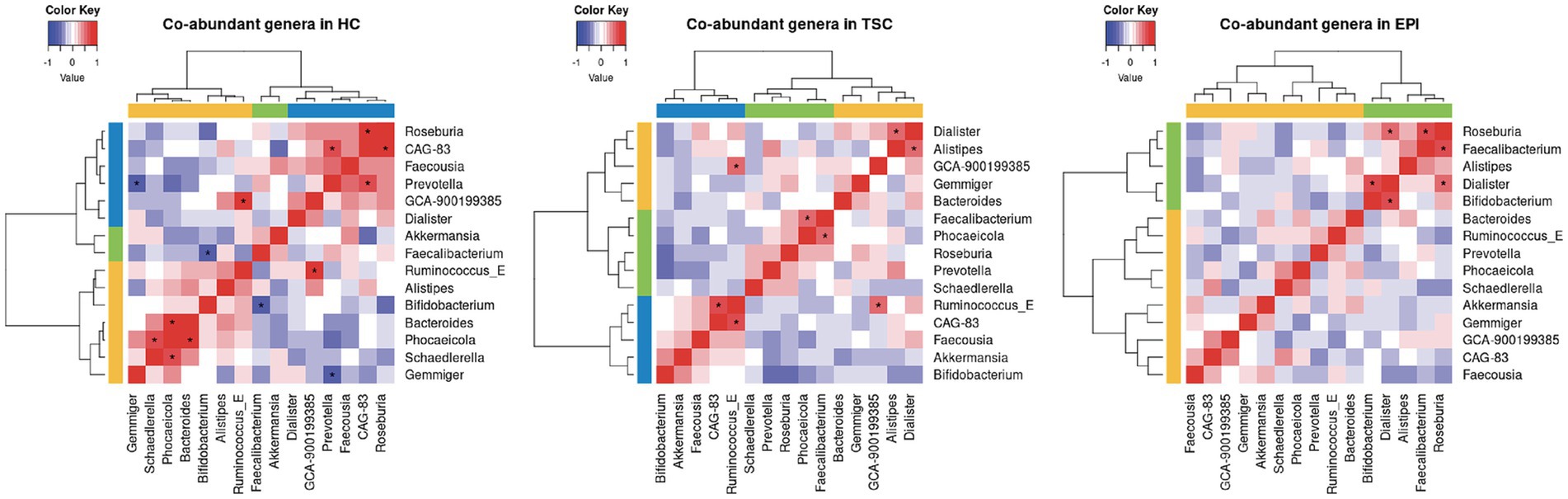 Figure 3. Co-abundance correlation analysis at genus level for HC, TSC, and EPI subjects. For each group, only taxa with relative abundance >0.01 are listed. Pearson’s correlation R values range from −1 (negative correlation, blue) to 1 (positive, red). Yellow, blue, and green hierarchical clusters represent different Co-Abundant Groups (CAGs). Asterisks (*) report statistical significance (adj p < 0.05).