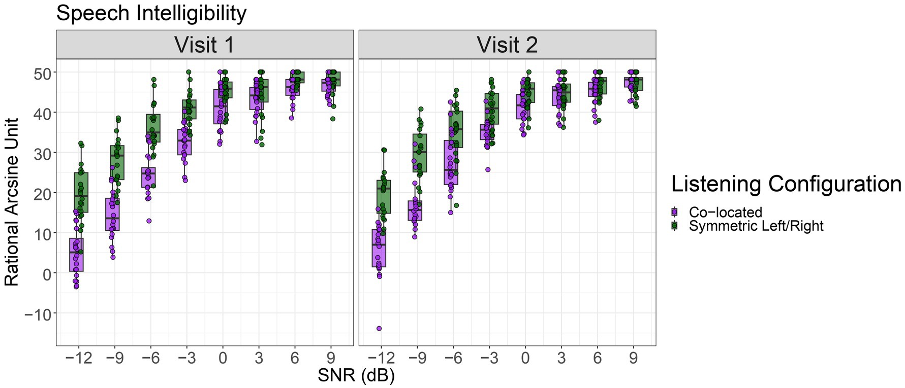 Figure 1. Speech intelligibility scores (in rational arcsine units) as a function of signal-to-noise ratio (SNR, dB) across two visits. Results are shown separately for co-located and symmetric left/right listening configurations. The boxes represent the range of the first and third quartiles, while whiskers extend to 1.5 times the inter quartile range.