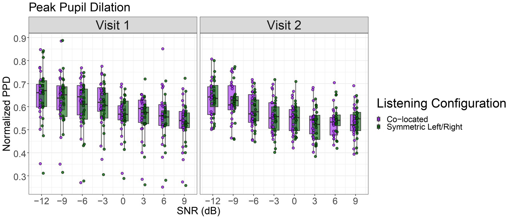 Figure 2. Range-normalized and baseline-corrected change in peak pupil dilation (PPD) as a function of signal-to-noise ratio (SNR, dB) across two visits and listening configurations. Data are shown for co-located and symmetric left/right listening conditions. The boxes represent the range of the first and third quartiles, while whiskers extend to 1.5 times the inter quartile range.
