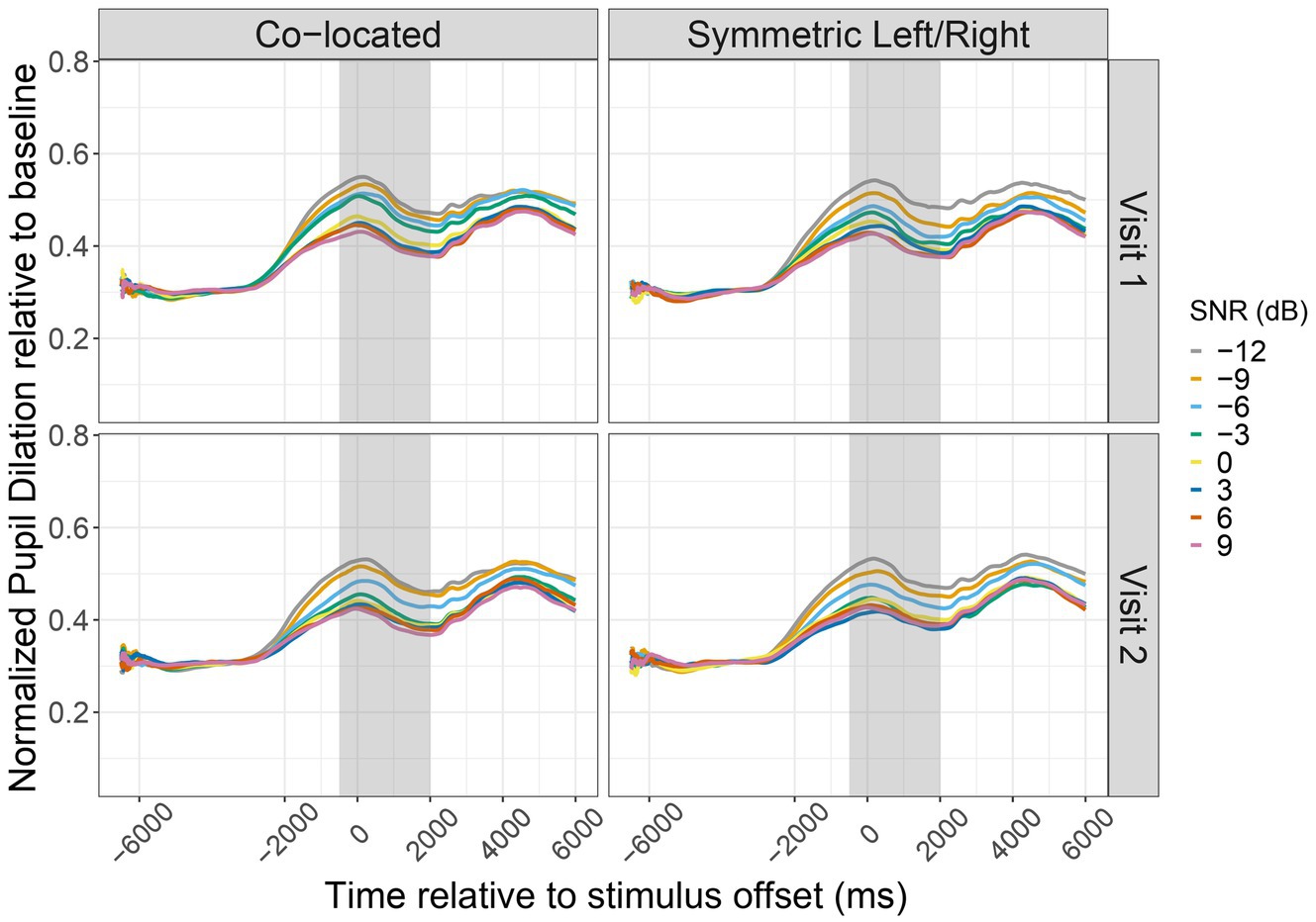 Figure 3. Range normalized and baseline-corrected pupil dilation averaged across participants plotted as a function of time relative to the stimulus’ offset. Each pupil track represents a different Signal-to-Noise Ratio (SNR) across Co-located and Symmetric Left/Right spatial conditions, shown separately for Visit 1 (top row) and Visit 2 (bottom row). Colored lines represent SNR levels from -12 dB to +9 dB. The shaded region represents the response window where peak pupil dilation (PPD) was extracted.