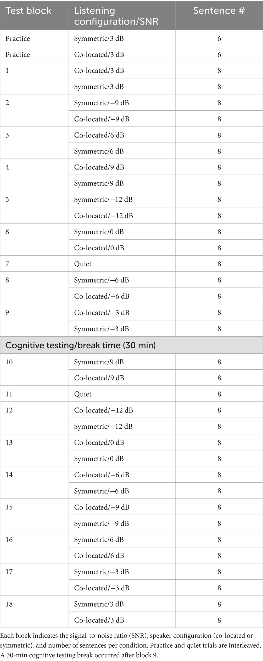 Participants completed two test sessions spaced two weeks apart, each lasting approximately 6 hours (h), labeled here as “Visit 1” and “Visit 2.” Each session was divided into two segments with a 20–30 minute break in between. To minimize fatigue, participants were encouraged to take additional breaks as needed. The structure of having two separate sessions was crucial for evaluating the reliability of measures over time. Each session began with six practice trials in both masked conditions (co-located and symmetric) at an SNR of +3 dB. These trials were designed to familiarize participants with identifying target speech amid background noise. During the main test, each listening condition (quiet, co-located, symmetric left/right) was presented at each SNR, totaling 272 sentences per session. Trials were presented in two blocks per condition, each containing eight sentences. The sequence of conditions was randomized for each participant, and each 8-sentence block contained randomly chosen sentences from the entire IEEE-sentence corpus, selected without replacement. For each SNR, trials in co-located and symmetric configurations were presented consecutively, employing a pseudo-random method. The overall design allowed systematic presentation of all conditions within each session while also allowing participants to familiarize themselves with the sound environments they would encounter while minimizing fatigue. In each block, a pseudorandom order of SNR and listening configuration (co-located or symmetric) was presented. Each condition consisted of 8 sentences per block. Cognitive testing and a 30-min break occurred midway through the session. Quiet trials were also interleaved as indicated in Table 1.