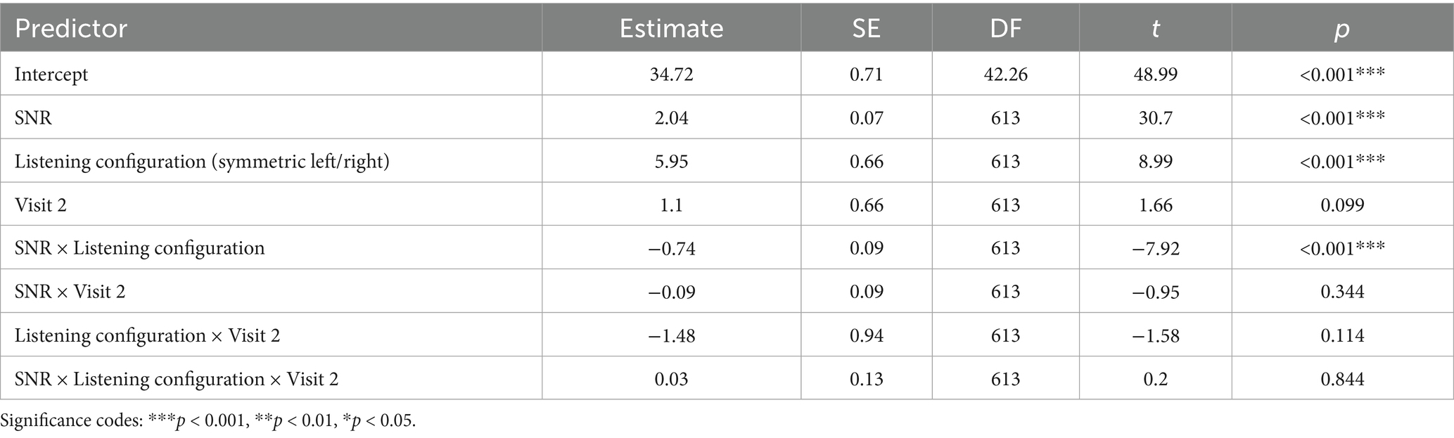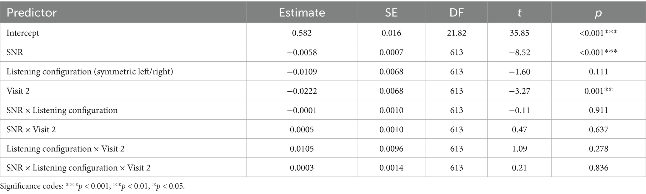 Both models evaluated main effects and all possible interactions among SNR, Listening Configuration, and Visit. Subject-specific random intercepts were included particularly to be able to evaluate SNR-Listening Configuration interactions. All analyses were conducted in R (version 4.2.0) using packages lme4 and lmerTest, with degrees of freedom and p-values estimated using Satterthwaite’s approximation.