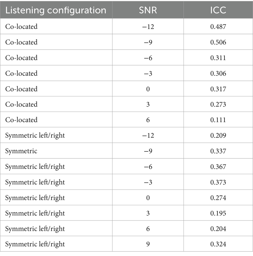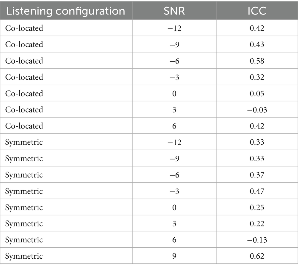 Additionally, test–retest reliability was assessed using intraclass correlation coefficients (ICC; range: 0–1) to quantify measurement consistency across sessions. ICCs represent absolute agreement which incorporates both consistency and between-subject variance. A normality test was not necessary for this dataset as we had 20 participants and a total of 5,112 raw data points across all configurations, SNRs, visits, and participants.