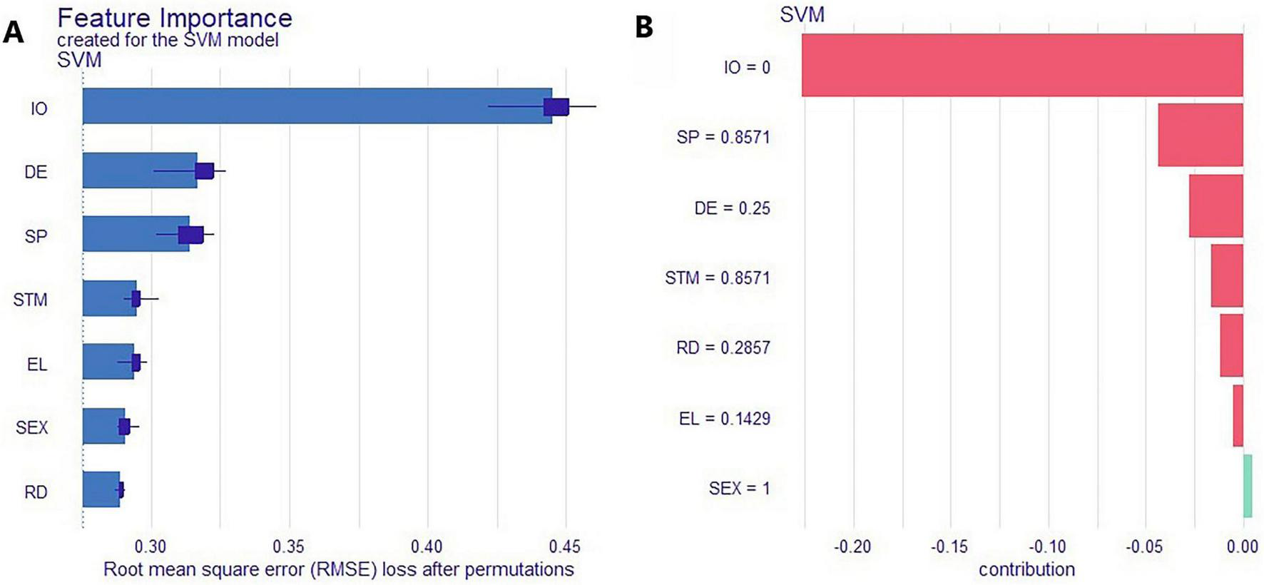 In addition, permutation importance was used to assess feature contributions, with RMSE employed to measure probabilistic prediction error. Keeping the trained classification model fixed, each feature was randomly permuted one at a time, and the RMSE between the model’s predicted probabilities and the observed binary outcomes (coded as 0/1) was calculated on the validation set. In binary classification settings, the mean squared error (MSE) of probability predictions is equivalent to the Brier score, and RMSE, as its square root, serves as an appropriate measure of probabilistic prediction error. To reduce randomness, this procedure was repeated across validation folds during cross-validation, and the results were averaged. The baseline RMSE without permutation was also reported for comparison.