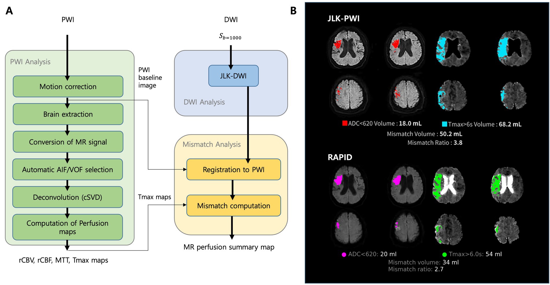 For infarct core estimation, RAPID employed the default threshold of ADC < 620 × 10−6 mm2/s. JLK PWI utilized a deep learning–based infarct segmentation algorithm applied to the b1000 DWI images, which was developed and validated in previous studies using large manually segmented datasets (Ryu et al., 2023, 2024, 2025).
