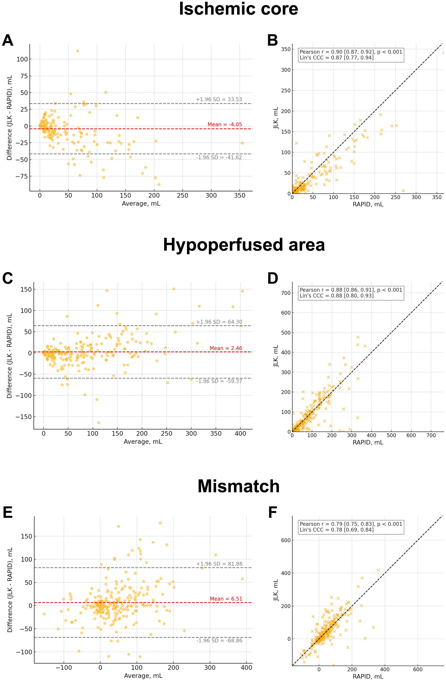 Figure 2. Agreement between JLK and RAPID perfusion outputs. Bland-Altman plots (A, C, E) show differences versus means for ischemic core, hypoperfused volume, and mismatch; central mean line and ±1.96 SD limits are drawn. Scatter plots (B, D, F) show correlations with linear fits; Pearson’s r and Lin’s concordance correlation coefficient (CCC) are reported. The panels summarize bias, limits of agreement, and strength of association across metrics, demonstrating high concordance for core and clinically meaningful agreement for hypoperfusion and mismatch.