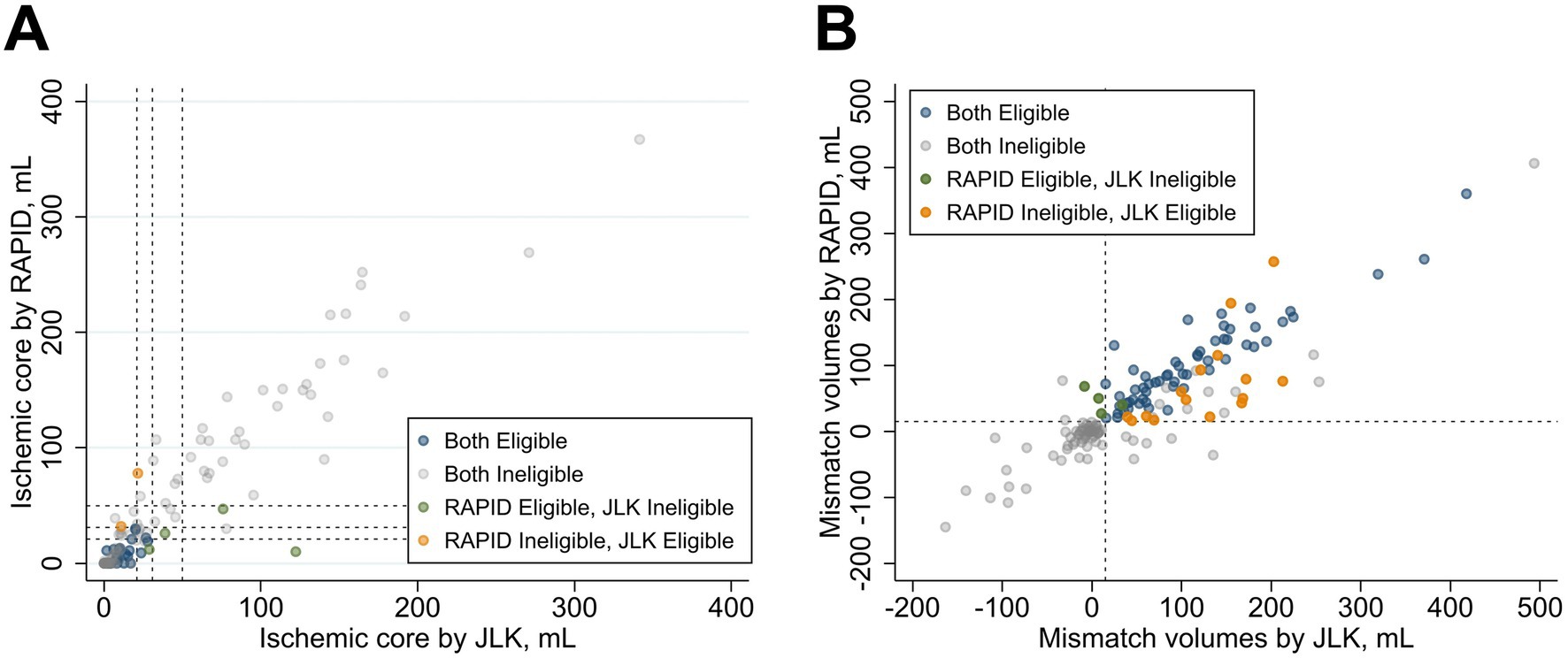 Figure 3. Outcome of selection criteria using RAPID versus JLK. Panel A compares ischemic core volumes (mL); Panel B compares mismatch volumes (mL). Points are colored by eligibility: both eligible (blue), both ineligible (gray), RAPID-only eligible (green), and JLK-only eligible (orange).