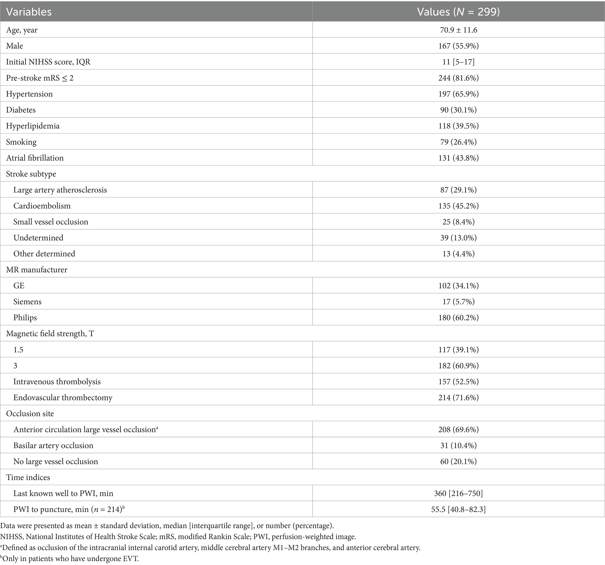 Regarding occlusion sites, 208 (69.6%) subjects had anterior circulation large vessel occlusion, and 31 had basilar artery occlusion (10.4%). Meanwhile, 60 (20.1%) subjects had no large vessel occlusion on MRI. The median time from the last known well to PWI was 360 min (IQR: 216–750) min, and the median time from PWI to groin puncture was 55.5 min (IQR: 40.8–82.3).