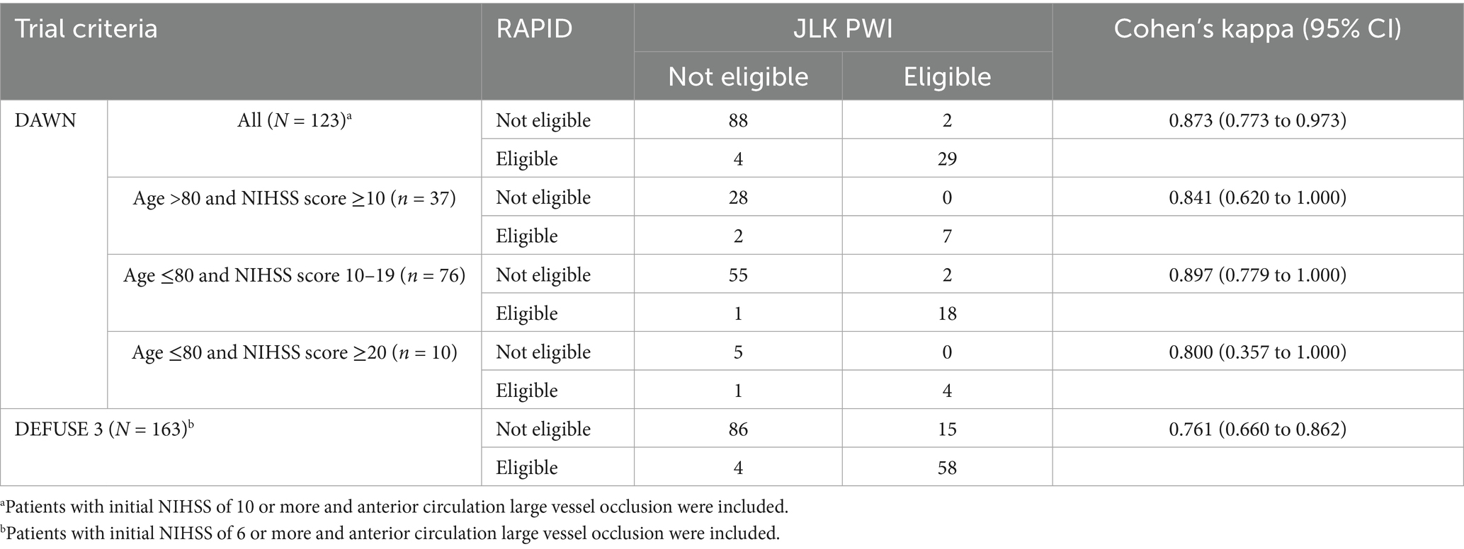 Table 2. Assessment of RAPID vs. JLK software in determining eligibility for endovascular thrombectomy based on DAWN and DEFUSE 3 trial criteria.
