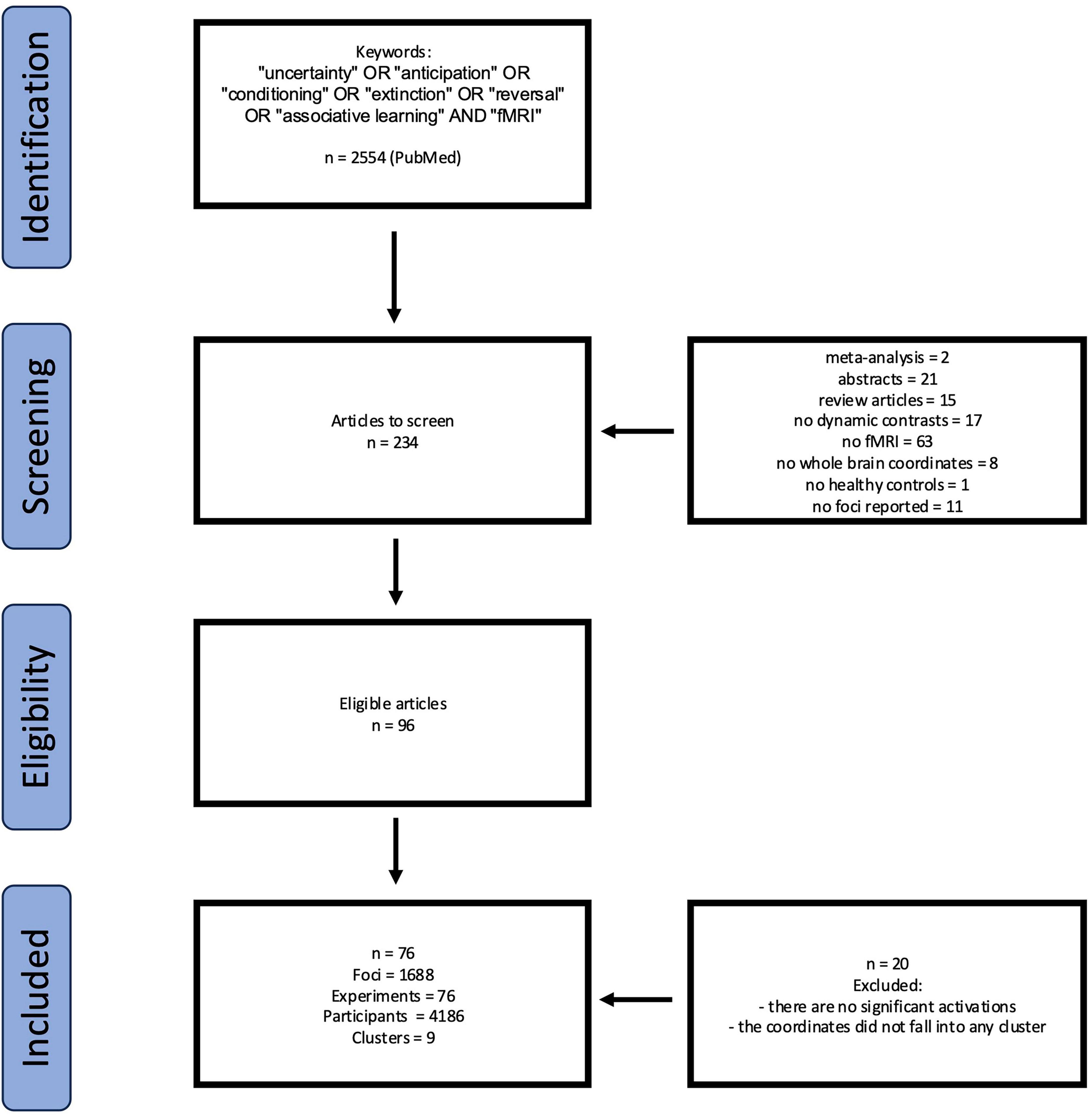 The initial literature search was conducted in July 2024, with the additional search in January 2025 to account for newly published studies. The literature search was conducted using PubMed database. Articles were selected using the following keywords: “uncertainty,” “anticipation,” “conditioning,” “extinction,” “reversal,” “fMRI” and “associative learning,” years 1995–2024. Initially, 2,554 articles were identified. Following preliminary screening for duplicates and required data (fMRI data and decision-making paradigms under uncertainty), 234 articles were selected for further analysis and subsequent clustering resulting in 76 eligible studies with the data collected on healthy adults, random-effects model. PRISMA chart represents the stages of data collection and selection (Figure 1). Studies were included if they: (1) used fMRI; (2) involved healthy adult participants; (3) employed a task explicitly involving active decision-making under conditions of uncertainty (e.g., risk, ambiguity, unpredictable threat, reversal learning); (4) reported whole-brain coordinates of significant activation contrasts related to uncertainty processing. Studies were excluded if they focused solely on perceptual uncertainty without a decision component or studied exclusively clinical populations.