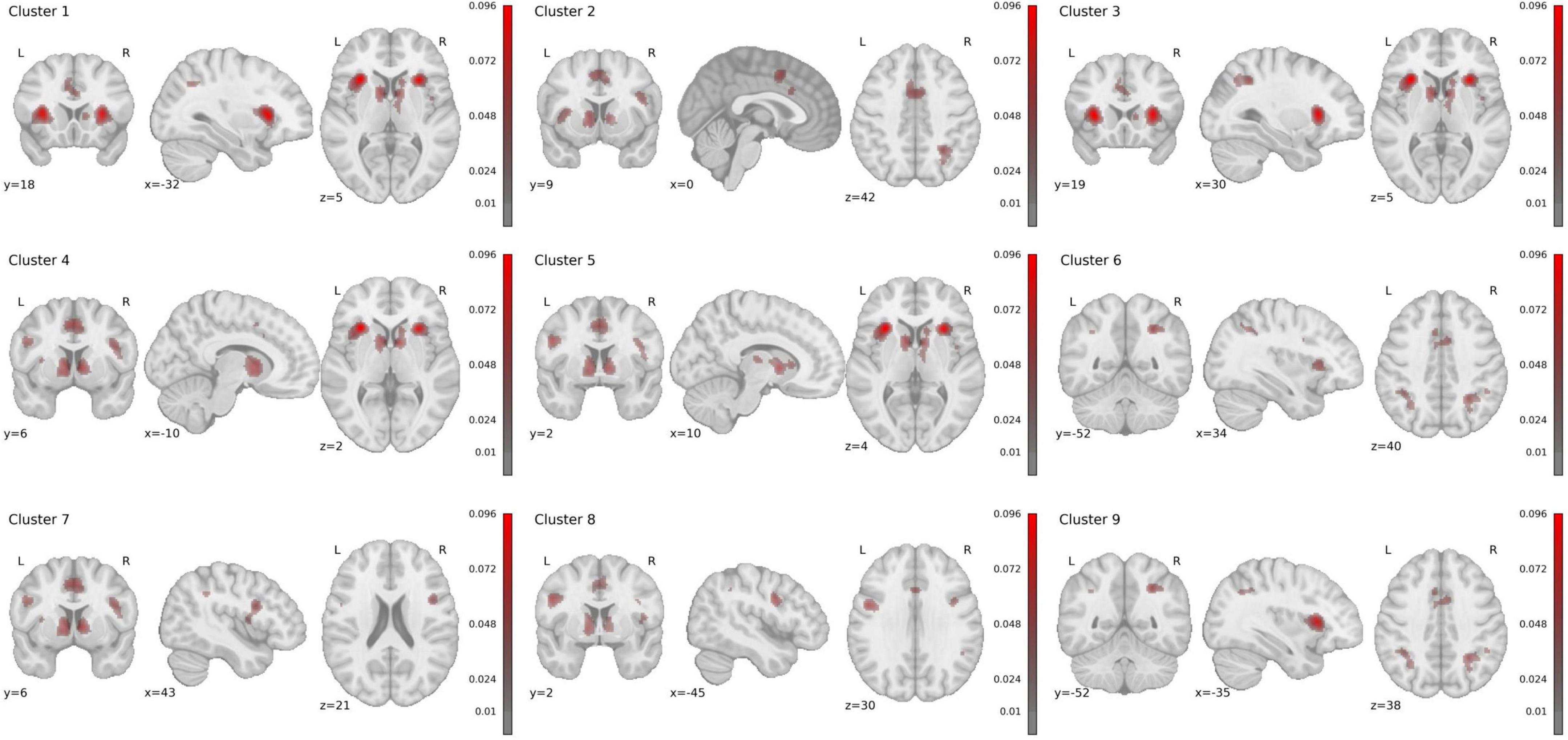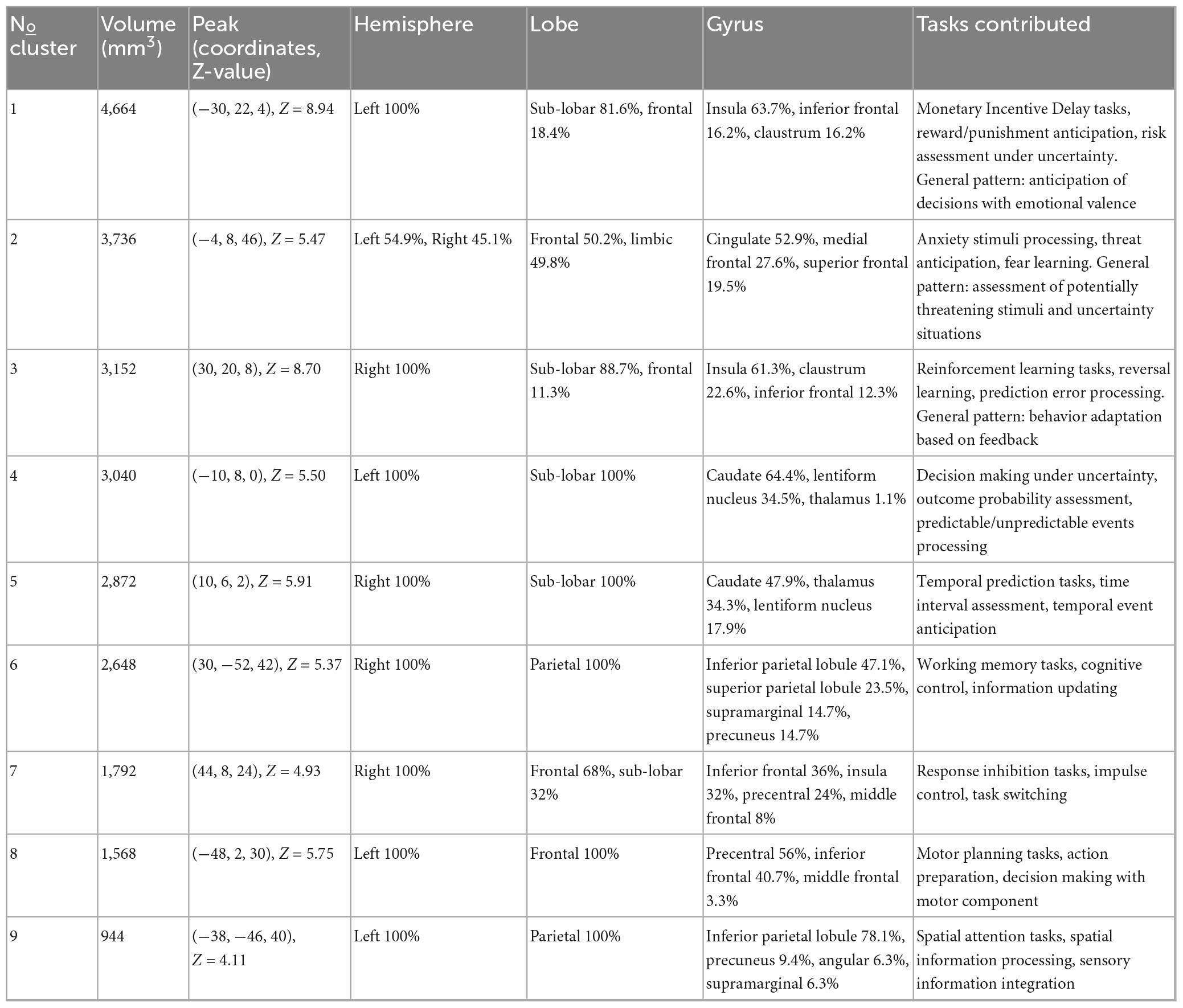 Results: The analysis revealed nine distinct activation clusters, revealing a comprehensive neural network involved in uncertainty processing. Key findings demonstrated predominant activations in the anterior insula (up to 63.7% representation), inferior frontal gyrus (up to 40.7%), and inferior parietal lobule (up to 78.1%). We found a functional specialization between emotional-motivational processes (clusters 1–5) and cognitive processes (clusters 6–9), with notable hemispheric asymmetries. The left anterior insula was more strongly associated with reward evaluation, while the right was involved in learning and cognitive control. Similarly, the right inferior frontal gyrus was linked to impulse control, and the left to motor planning.