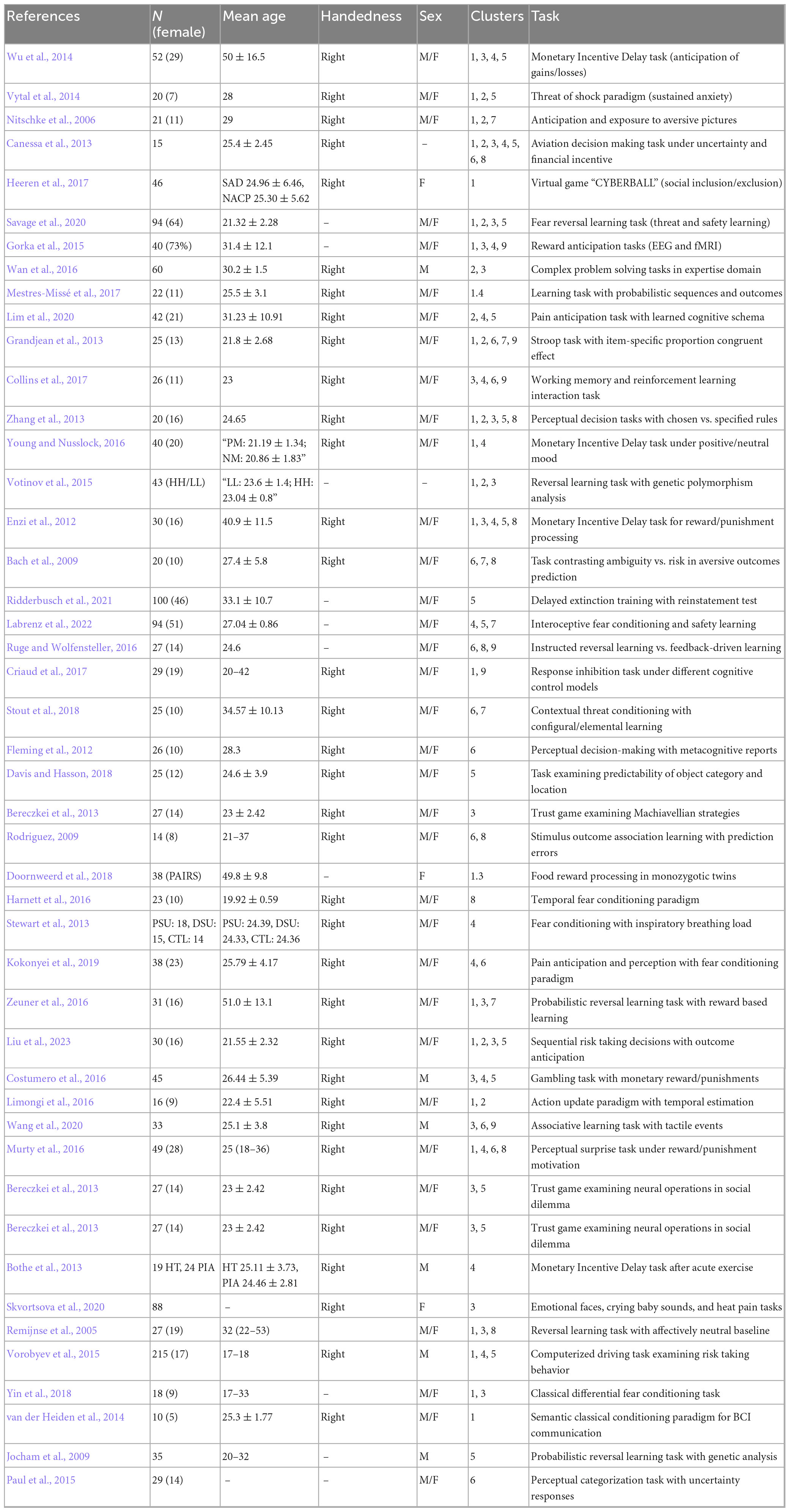 This study employed the Activation Likelihood Estimation (ALE) method, which enables voxel-wise analysis of images with random effects. GingerALE 3.0.2 was utilized in the current investigation. The software allows the use of coordinates to create a probabilistic activation map using ALE values. These values provide information about statistical maps of probable activation in relation to the tasks included in the analysis. For data consistency, coordinates presented in Montreal Neurological Institute (MNI) format were converted to Talairach space. Statistical significance was assessed using cluster-level correction for multiple comparisons at p = 0.05 and a cluster-forming threshold of p < 0.001 (Eickhoff et al., 2012, 2017). The following are the articles included in the final list of publications included in the results of the analysis (Table 1).