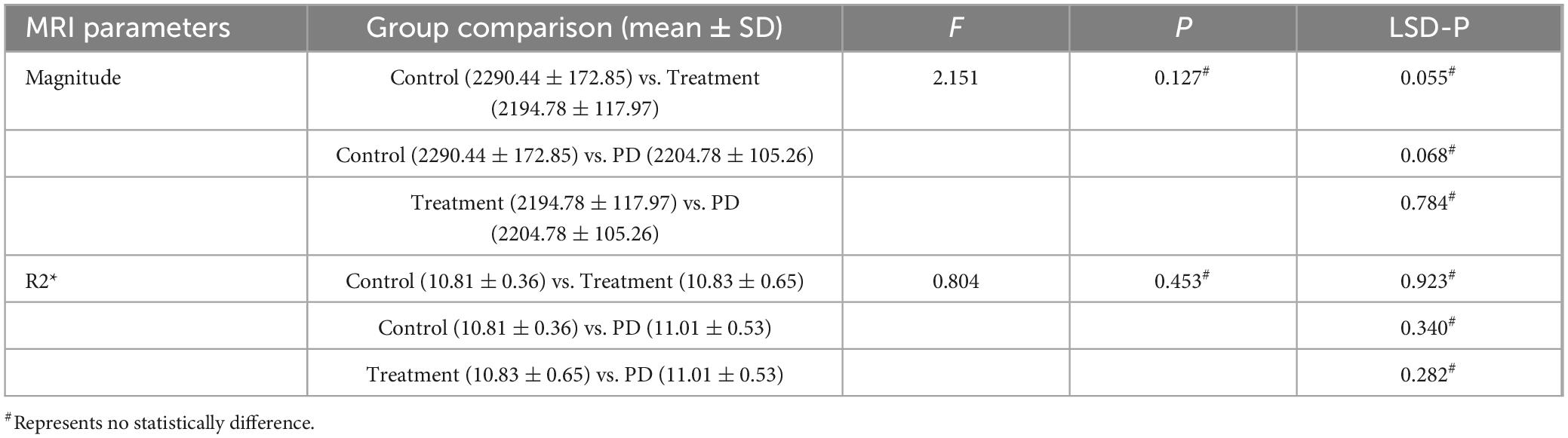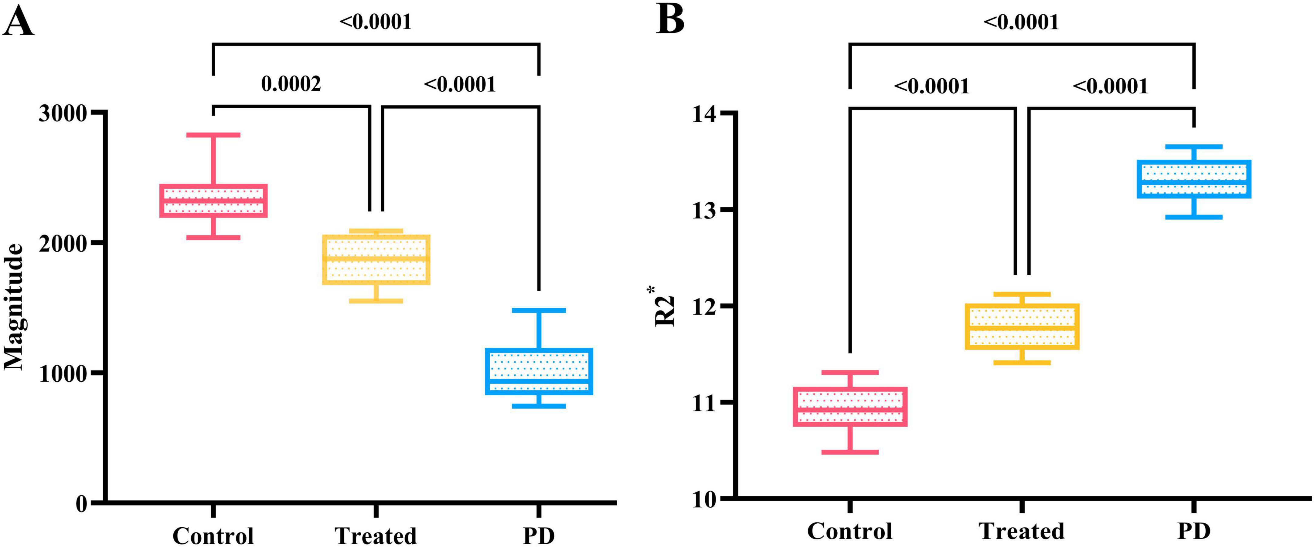 Figure 1. (A) Shows the comparison results of magnitude values in the right SN region of three groups of rats at the 6th week. The magnitude value of the control group was the highest, followed by the treatment group, while the PD group had the lowest magnitude value, with statistically significant differences. (B) Displays the comparison results of R2* values in the right SN region of the three groups at the 6th week. The control group had the lowest R2* value, followed by the treatment group, while the PD group had the highest R2* value, and the differences were statistically significant.
