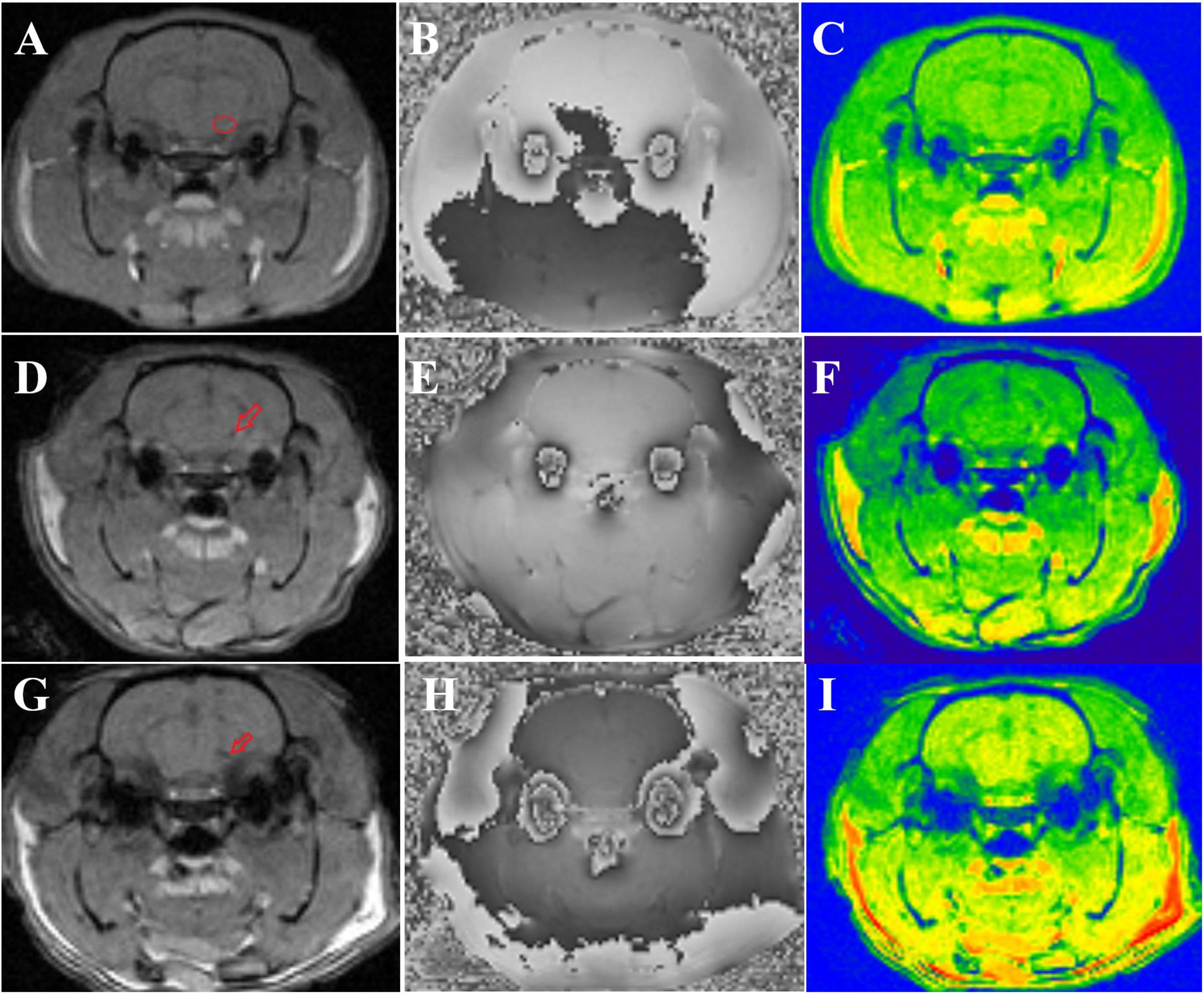 Figure 2. Shows the magnetic resonance images of three groups of rats. (A–C) Display the magnitude, phase, and R2* map of control group rats, respectively. The small red circle in panel (A) indicates the location of the ROI outlined in the right SN. (D–F) show the magnitude, phase, and R2* map of treatment group rats, respectively, with the small red arrow in panel (D) indicating iron deposition in the right SN. (G–I) present the magnitude, phase, and R2* map of PD group rats, respectively, and the small red arrow in panel (G) denotes iron deposition in the right SN.