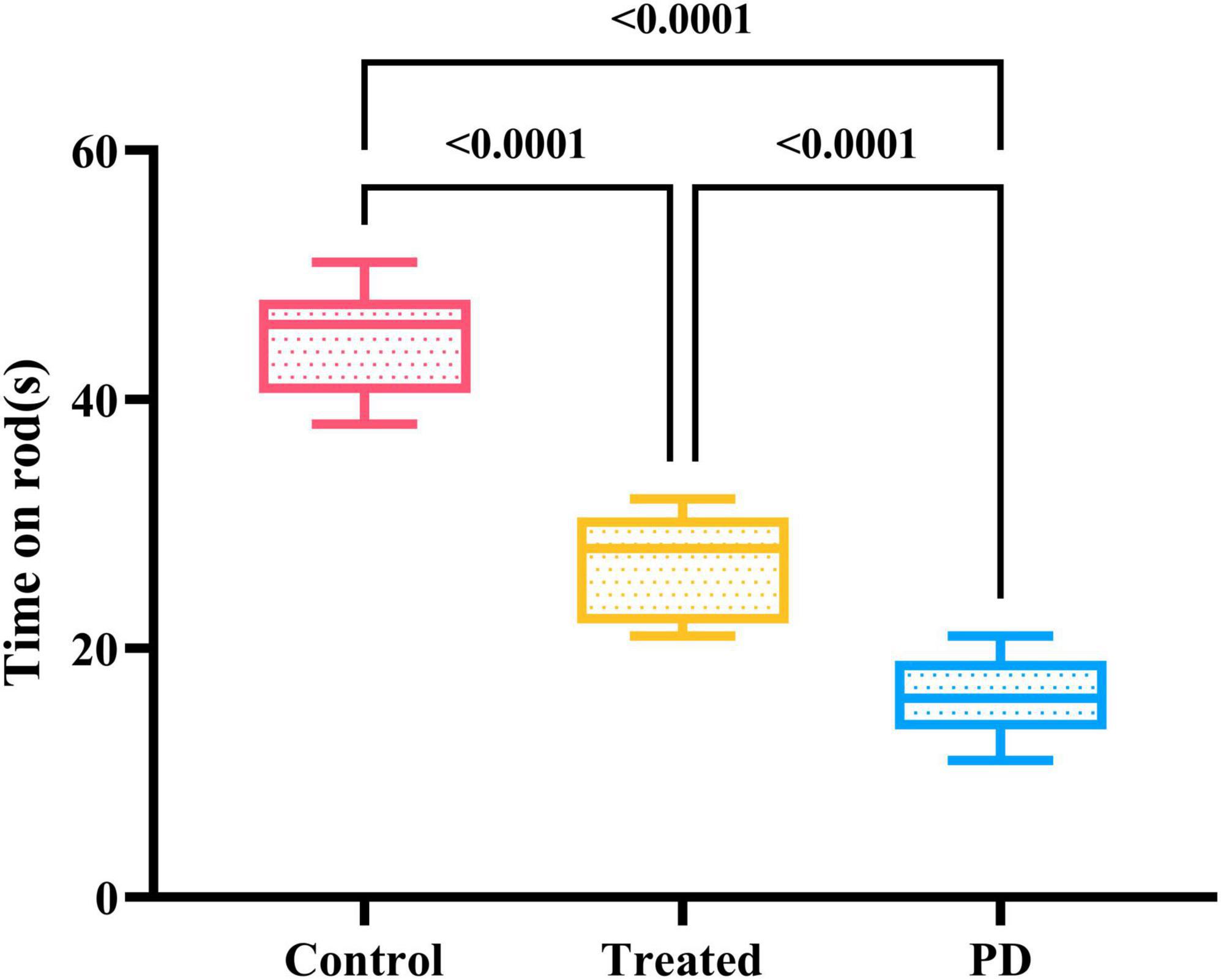 Both the Parkinson’s and the treatment group rats passed the apomorphine rotation test. The results of the wire grip test in the three groups of rats showed that the duration of persistence on the wire of PD rats was significantly lower than that of the treatment and control groups, and the difference was statistically significant (F = 36.48, p < 0.0001). Among them, the persistence time of rats in the treatment group remained lower than that in the control group, which reflects that active probiotic treatment can lead to a certain degree of recovery in the motor ability of rats (Figure 3).