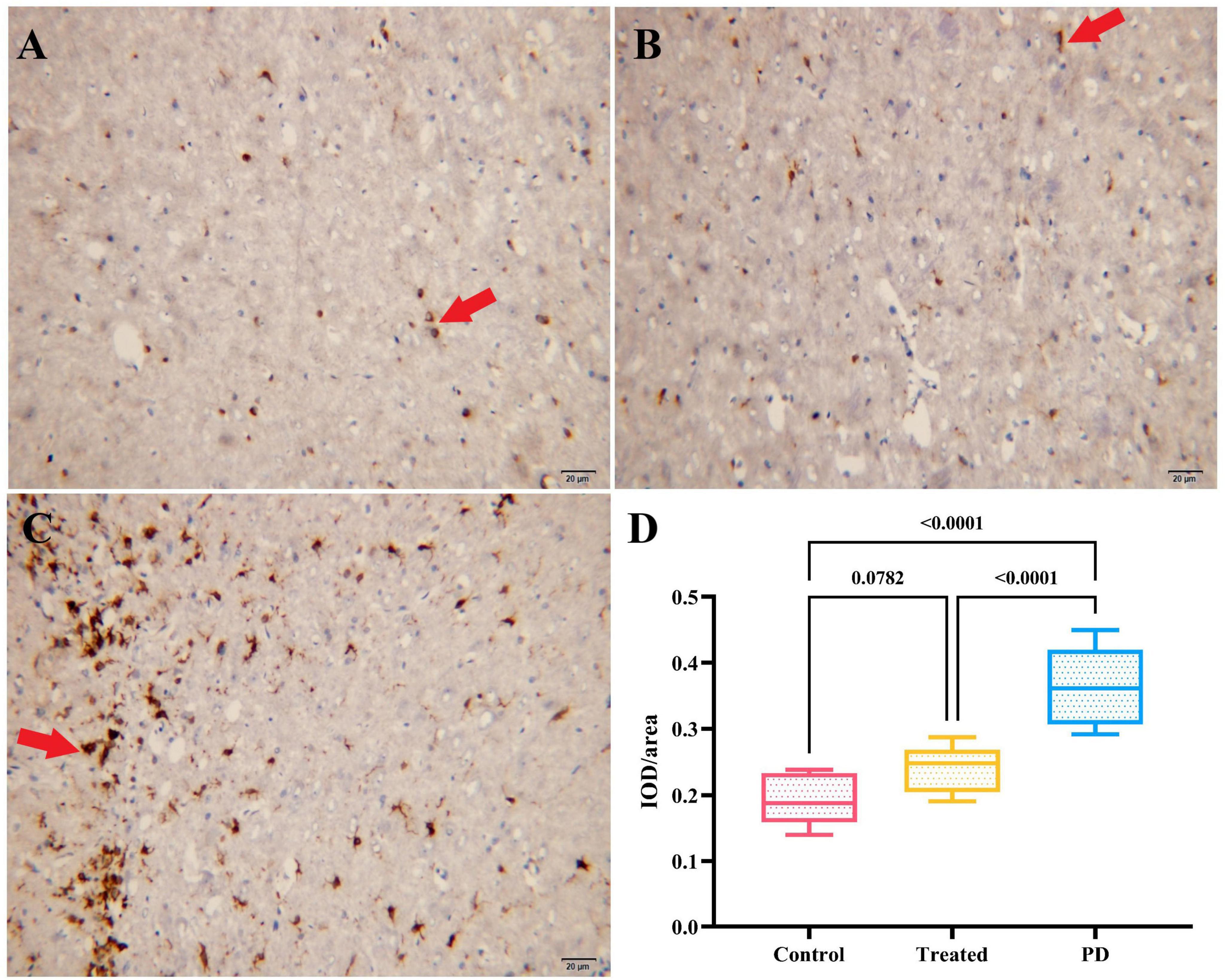 Figure 4. (A–C) Show the iron staining results of the right SN region in the control group, treatment group, and PD group rats, respectively. The cells indicated by the red arrows are iron stain-positive cells. (D) Displays the comparison of IOD/area values of iron staining in the right SN region among the three groups. The PD group had the highest IOD/area value of iron staining, followed by the treatment group, and the control group had the lowest value.