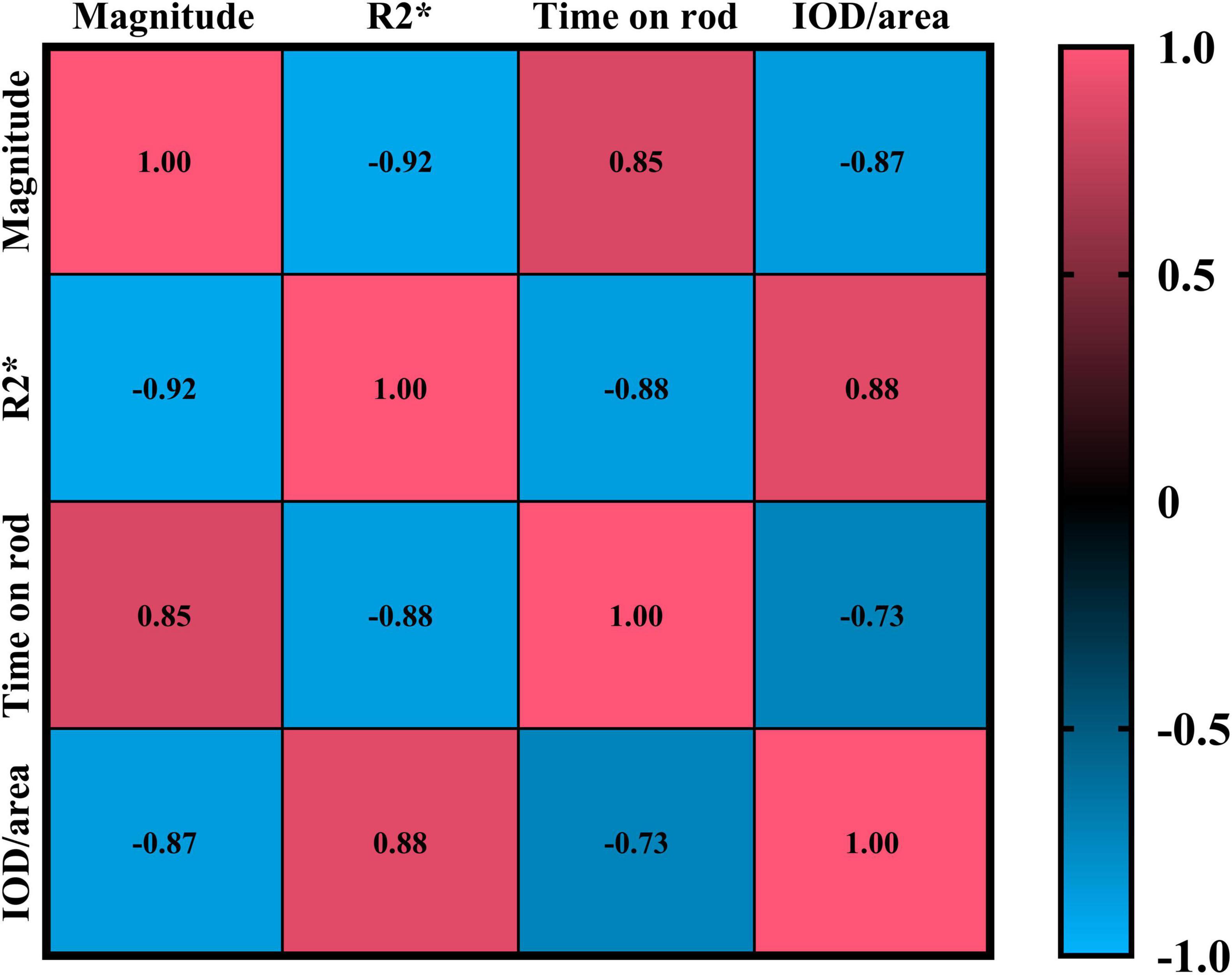 Figure 5. Shows the Pearson correlation results of Magnitude, R2*, time on rod, and IOD/area. In the figure, red indicates a positive correlation, and blue indicates a negative correlation. The numbers in the figure represent correlation coefficients, with all p < 0.0001.