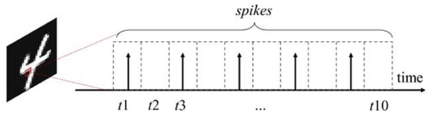 Figure 1. Schematic diagram of poisson coding, where t1 − t10 denote the 10 time-steps of the spike sequence.